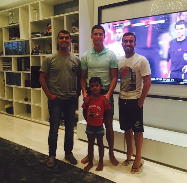| Vì đang chấn thương nên Ronaldo phải theo dõi đồng đội thi đấu với Bayern qua màn ảnh nhỏ cùng con trai và bạn bè. |