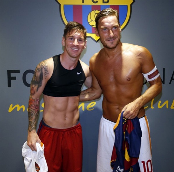 | Bất chấp scandal bóp cổ Yanga-Mbiwa trên sân, Messi vẫn vui vẻ chụp hình kỷ niệm với Totti. Ngôi sao Barca vạch áo để đọ bụng 6 múi cùng chân sút người Italy. |