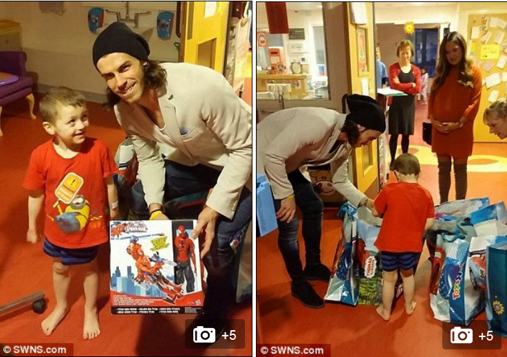 | Bale gây bất ngờ khi biến giấc mơ của cậu nhóc 3 tuổi thành hiện thực đúng đêm Giáng sinh. Ngôi sao Real đích thân tới tận bệnh viện, nơi cậu bé đang điều trị bệnh để tặng quà và động viên. |