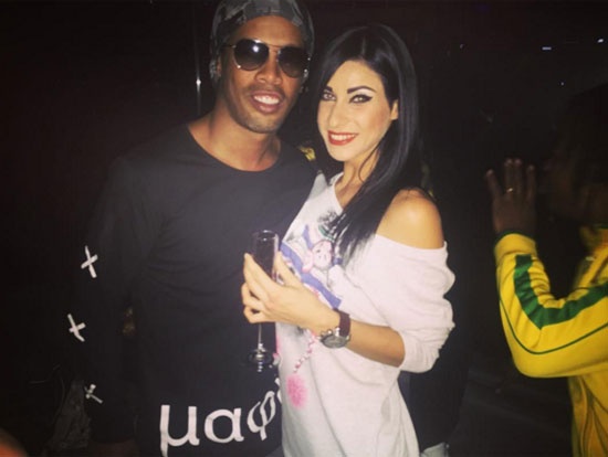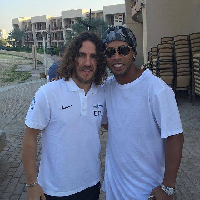 | Ronaldinho tay bắt mặt mừng khi bất ngờ tái hợp Puyol. |