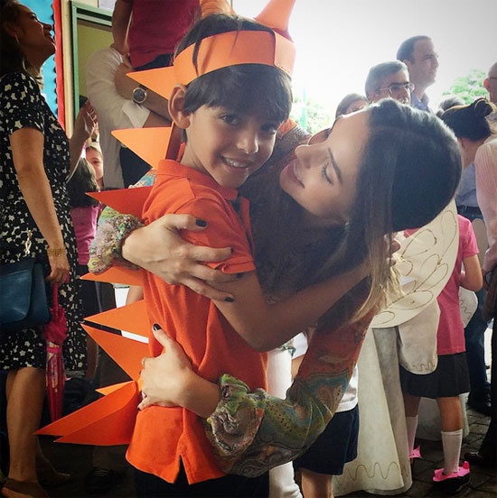 | Con trai Kaka đáng yêu trong bộ trang phục hóa trang khủng long màu da cam. |