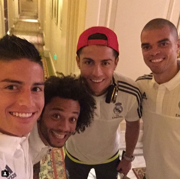 | James Rodriguez cùng Marcelo, C. Ronaldo và Pepe tinh nghịch chụp hình selfile khi đội bóng đang có mặt tại Trung Quốc tham gia du đấu. |