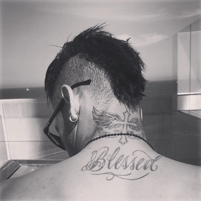| Ngôi sao người Brazil khoe hình xăm thánh giá cùng đôi cánh tung bay. Phía dưới là dòng chữ "Blessed" được Neymar xăm khi mới đặt chân tới Barcelona. |