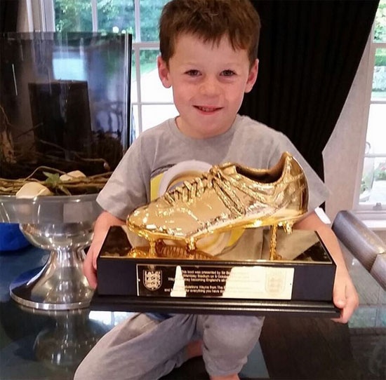 | Cậu nhóc Kai Rooney thích thú khoe chiếc giày vàng dành cho chân sút ghi nhiều bàn thắng nhất đội tuyển Anh của bố. |