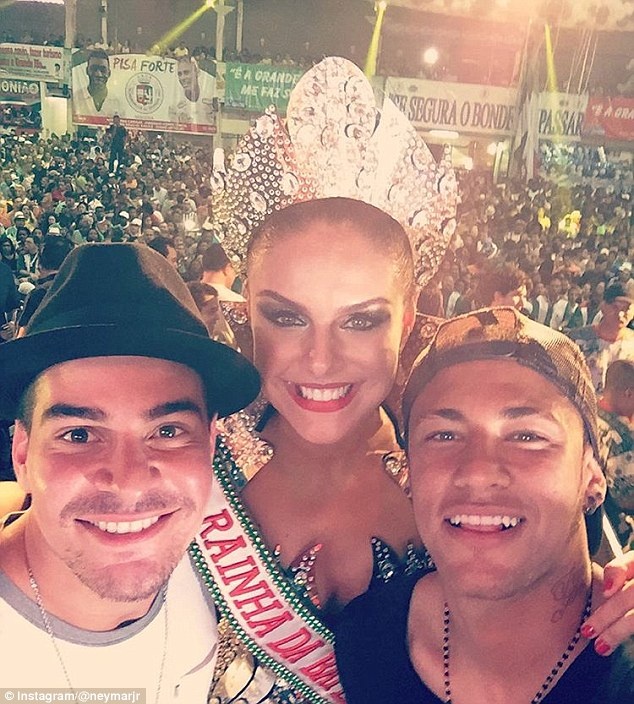 | Neymar phấn khích khoe ảnh chụp cùng người đẹp Paloma Bernardi và nam tài tử Thiago Martins. |