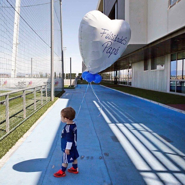 | Bé Martin cầm trái bóng bay to bên lề sân cỏ với dòng chữ "Chúc mừng bố" để mừng Iker Casillas bước sang tuổi 34. |