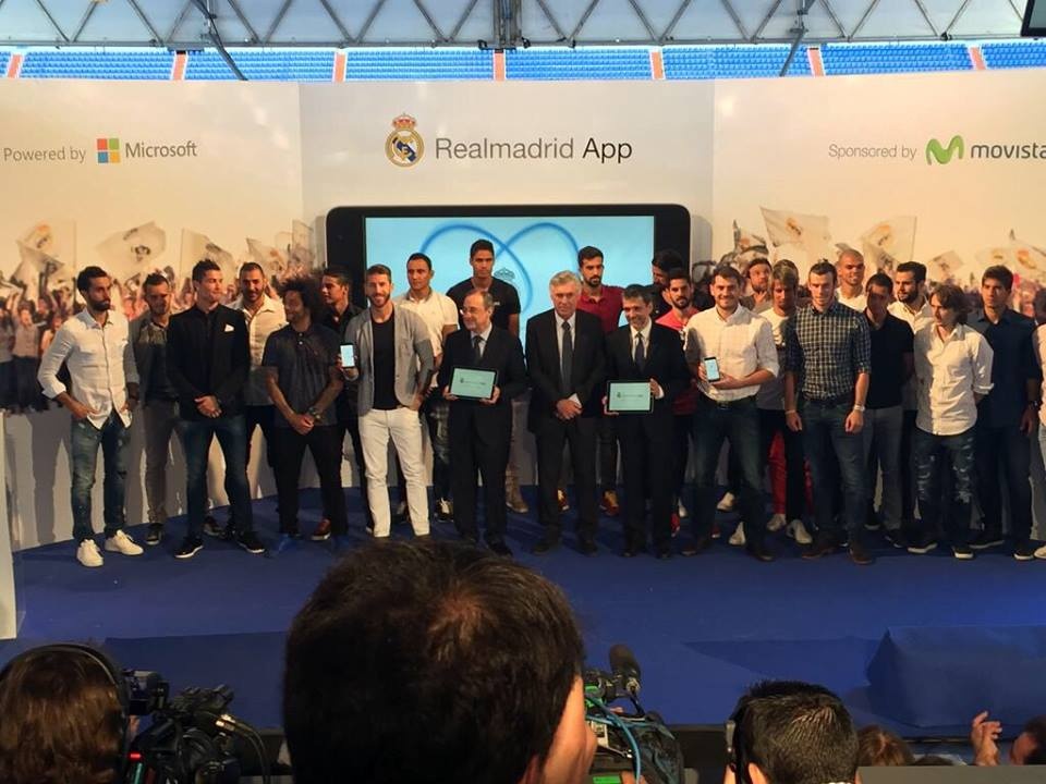| Ban huấn luyện cùng dàn sao Real trong lễ ra mắt phần mềm Real Madrid. CLB hợp tác với Microsoft cho ra ứng dụng giúp tăng cường tương tác giữa các cầu thủ và người hâm mộ. |