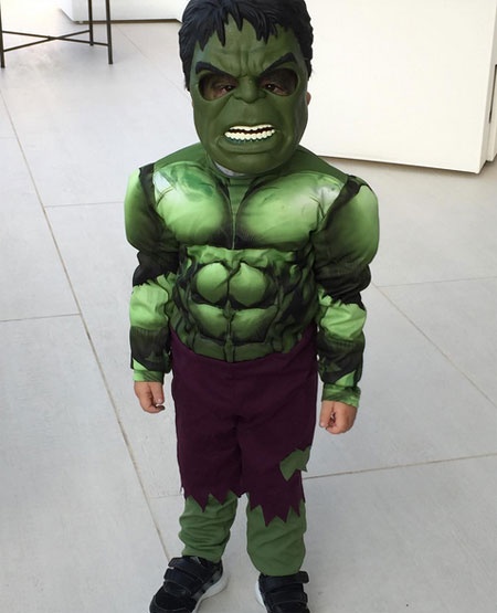 | Bạn gái Messi chia sẻ ảnh cậu con trai Thiago đáng yêu trong bộ trang phục hóa trang thành người khổng lồ xanh. |
