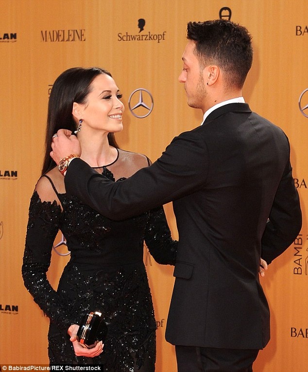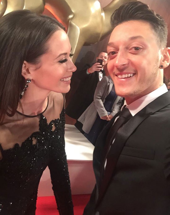 | Oezil quan tâm, chăm sóc bạn gái trên thảm đỏ. |