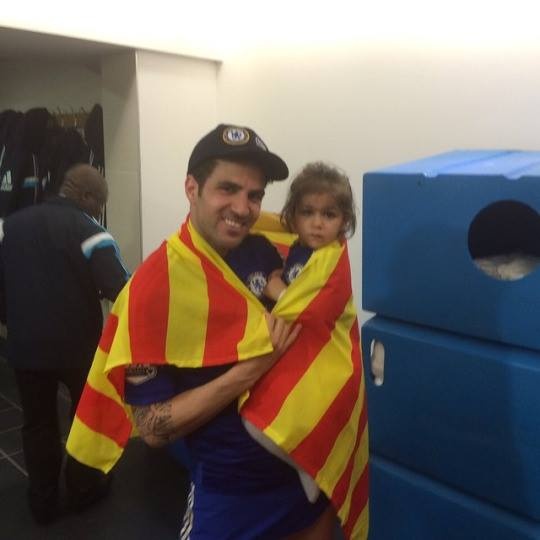 | Fabregas khoác cờ Catalunya, ôm con gái ăn mừng chức vô địch sớm của Chelsea. |