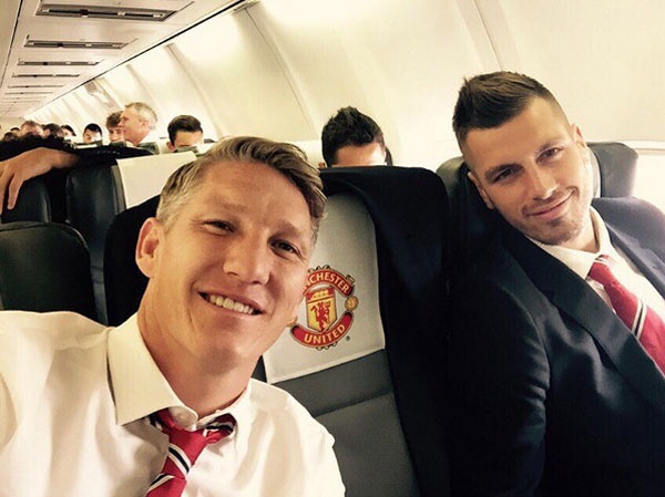 | Tiền vệ Bastian Schweinsteiger và đồng đội Morgan Schneiderlin rủ nhau selfile trên máy bay trong chuyến làm khách CLB Brugge (Bỉ) ở trận lượt về play-off tranh vé dự vòng bảng Champions League (1h45 ngày 27/8, Zing.vn tường thuật trực tiếp). |