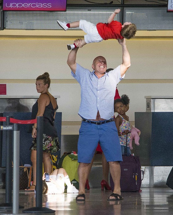 | Trở về sau kỳ nghỉ tại Barbados, bé Kai Rooney nằm ngay dưới sảnh sân bay chơi điện thoại trong khi bé Klay thích thú khi được ông ngoại chơi tung hứng. |