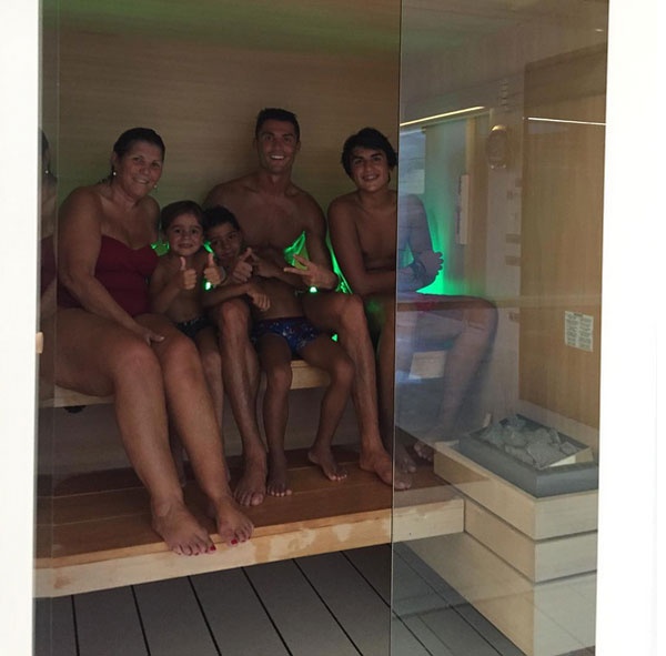 | "Xả hơi trong phòng xông hơi cùng gia đình" - ngôi sao Real Madrid chia sẻ. Thời gian gần đây, Ronaldo đặc biệt dành nhiều thời gian bên mẹ và con trai. |