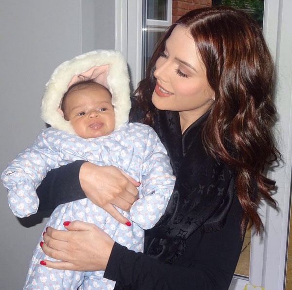 | Helen Flanagan, bạn gái tiền vệ Scott Sinclair bế con gái nhỏ đi cổ vũ ngôi sao Aston Villa. |