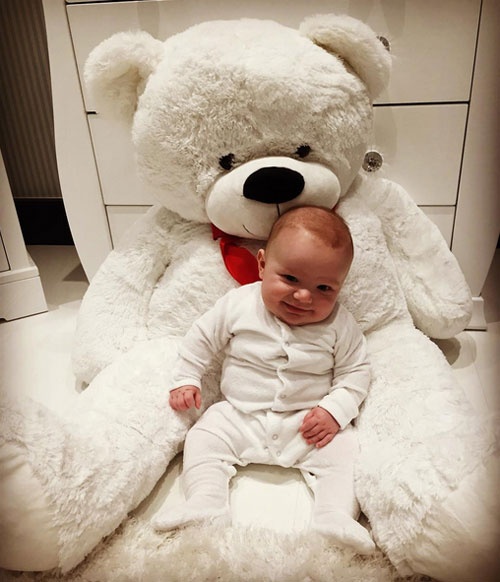 | Con trai của Andy Carroll toe toét cười trong lòng chú gấu bông khổng lồ. |