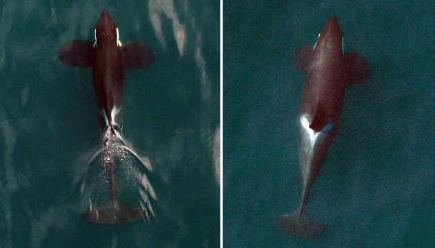 Bức ảnh chụp hai con cá voi sát thủ từ thiết bị bay không người lái. Nó cho thấy con cá voi ở bên trái gầy và yếu hơn so với con cá voi ở bên phải. Trong thế giới tự nhiên, những con khỏe mạnh thường có cơ hội sống và duy trì nòi giống cao hơn. |
