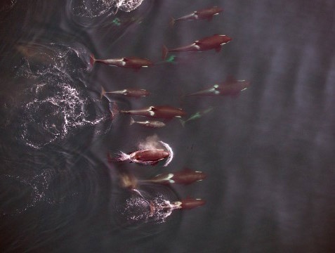 Người ta cũng dựa vào kích thước để tìm hiểu đặc tính của cá voi. Những con cá gầy yếu thường bơi phía ngoài của đàn trong khi các cá thể khỏe mạnh bơi ở phía trong. Cơ thể những con cá mang thai thường phồng hơn ở phía sau khung xương sườn (cá thể ngoài cùng phía dưới). |