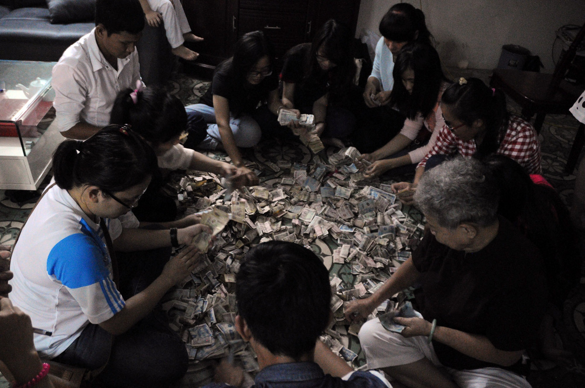 | Những đồng tiền lẻ tiết kiệm được sau mỗi ngày của mọi người trong CLB được bung ra trên nền đất. |