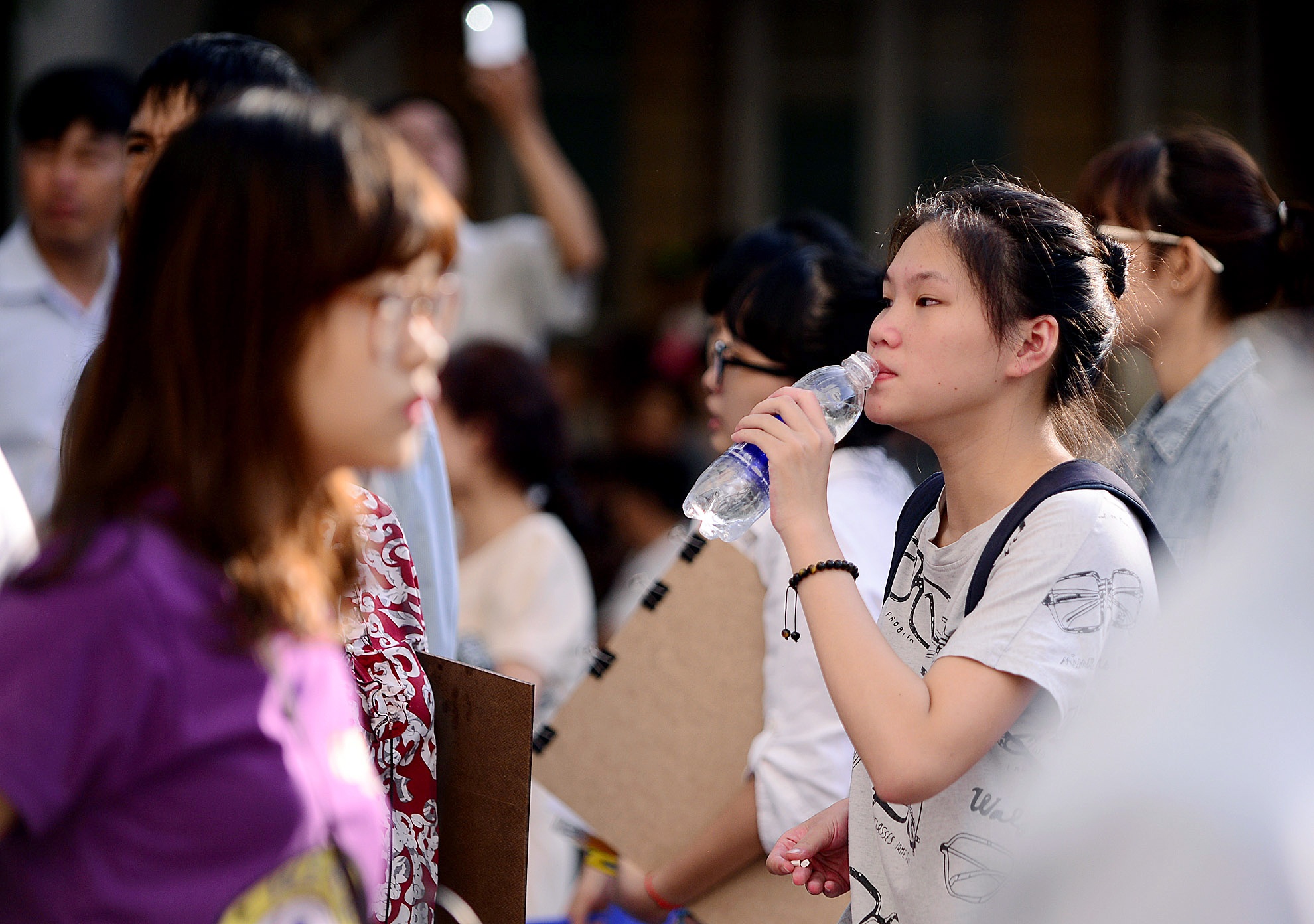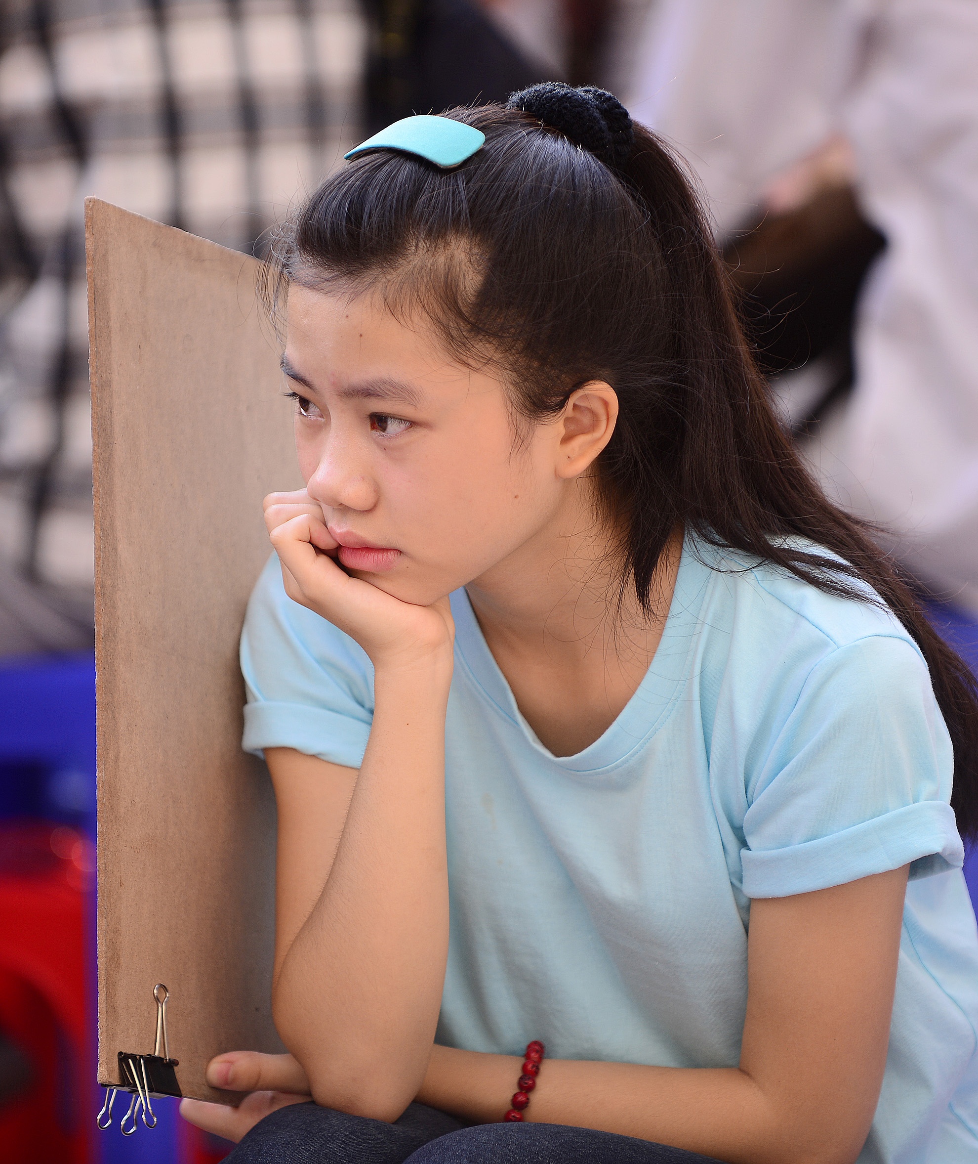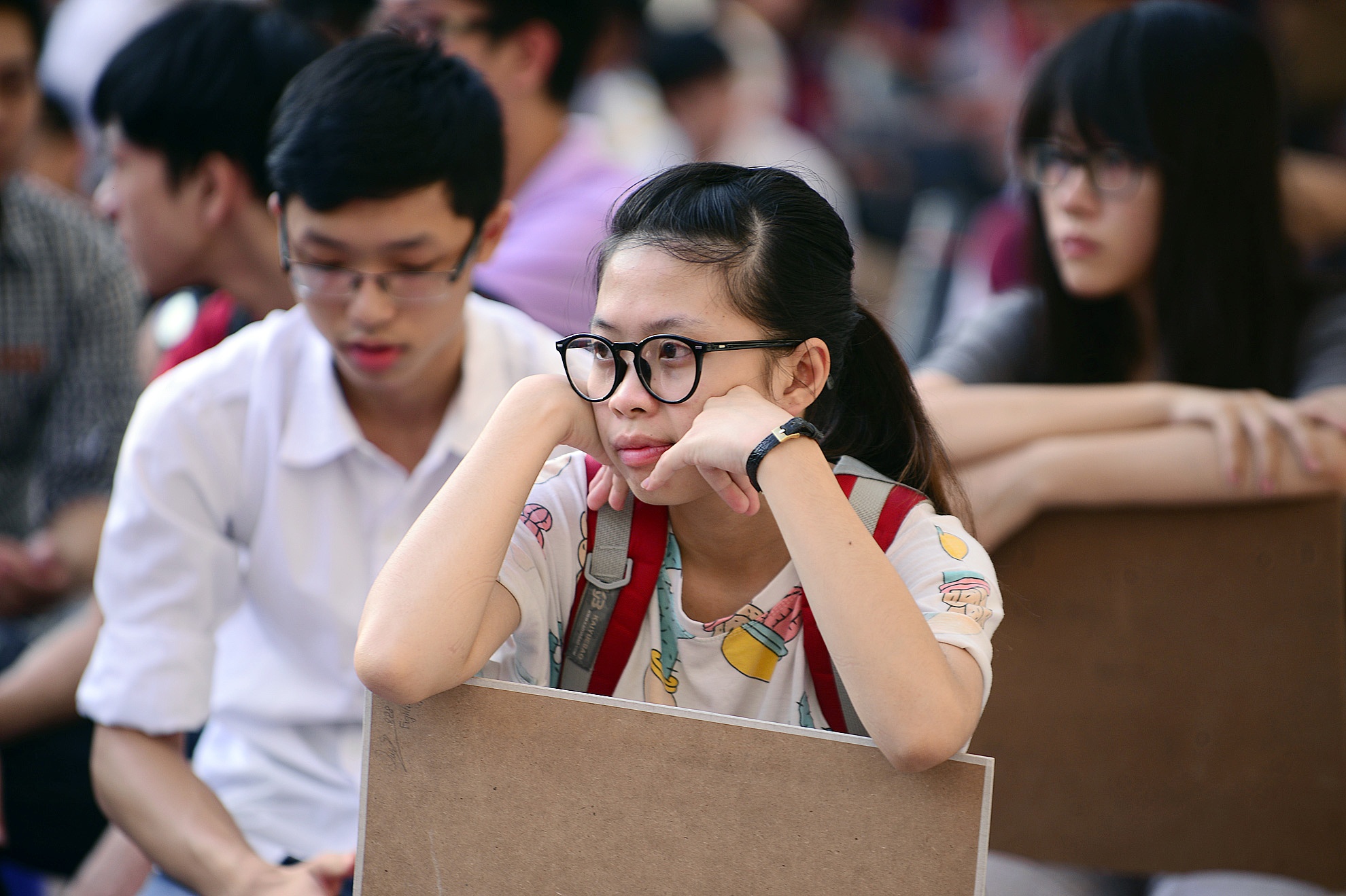 | Nhiều thí sinh tỏ ra mệt mỏi ngồi ở sân trường chờ đến thời gian vào phòng thi. |