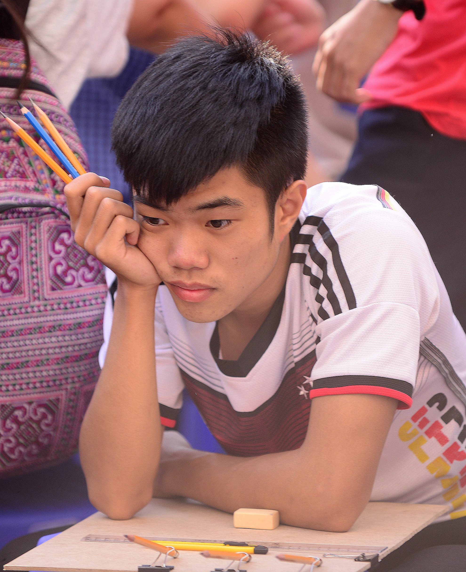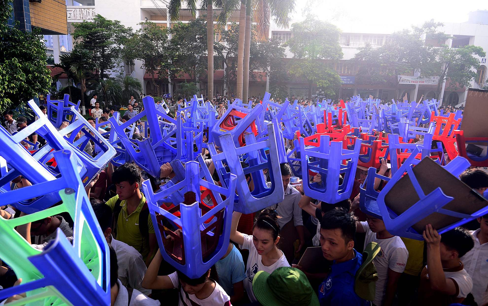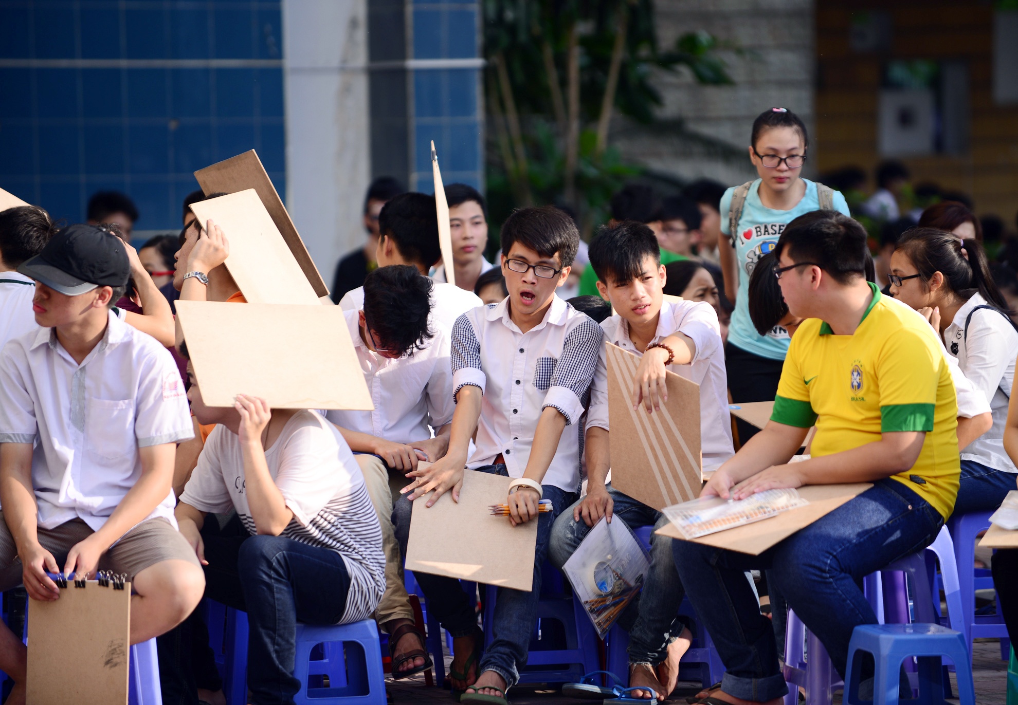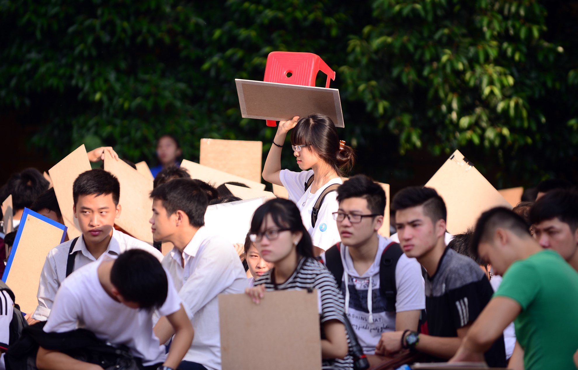 | Sáng sớm, Hà Nội đã nắng nóng khiến nhiều bạn trẻ khó chịu. Thí sinh dự thi Đại học Kiến trúc Hà Nội mang ghế theo nhu cầu, để thuận lợi cho việc thực hành môn vẽ. Về phía nhà trường có cung cấp ghế ngồi tại phòng thi. |