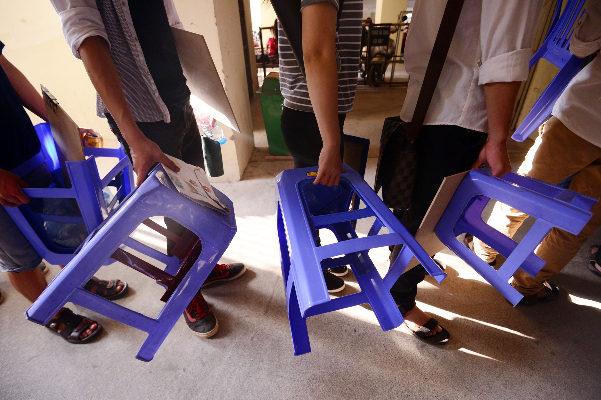 Ngoài việc phải tự túc mang giá vẽ, màu, các thí sinh còn cầm theo mỗi người hai chiếc ghế nhựa để ngồi làm bài thi. Nhà trường sẽ cung cấp giấy thi, giấy nháp.