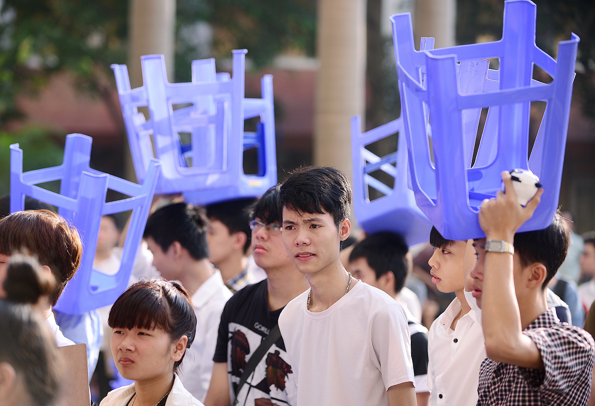 Do phải tự túc chuẩn bị giá vẽ, bút và nhiều dụng cụ khác, các thí sinh đi thi môn năng khiếu tại Đại học Kiến Trúc (Hà Nội) phải đội ghế lên đầu để tránh nắng và đỡ vướng víu.