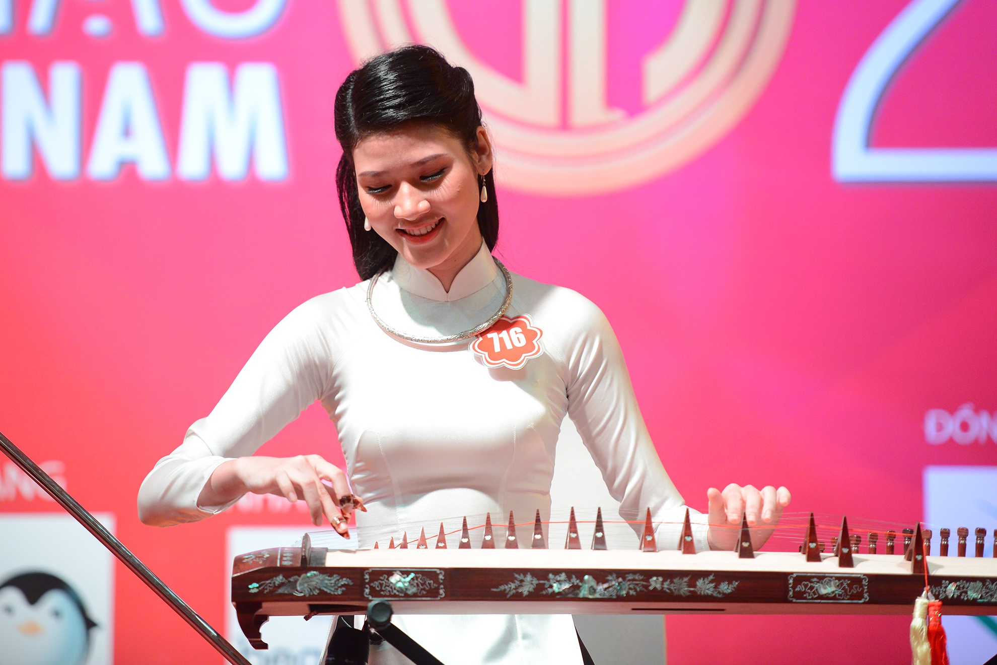 | Đan xen những màn múa dịu dàng uyển chuyển là những phần thi tài năng với đạo cụ khá ấn tượng. Thí sinh Diễm Quỳnh độc tấu đàn tranh. |