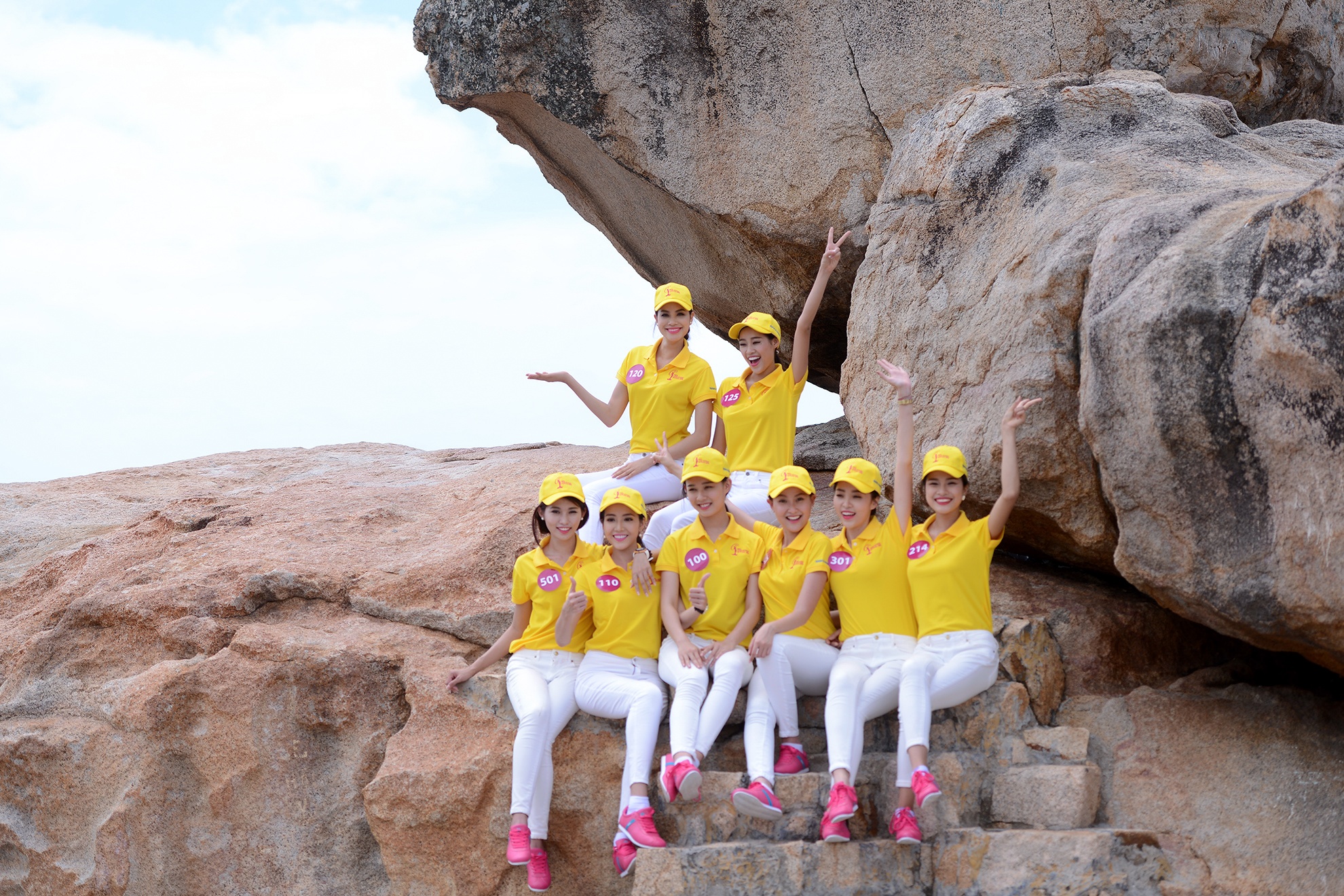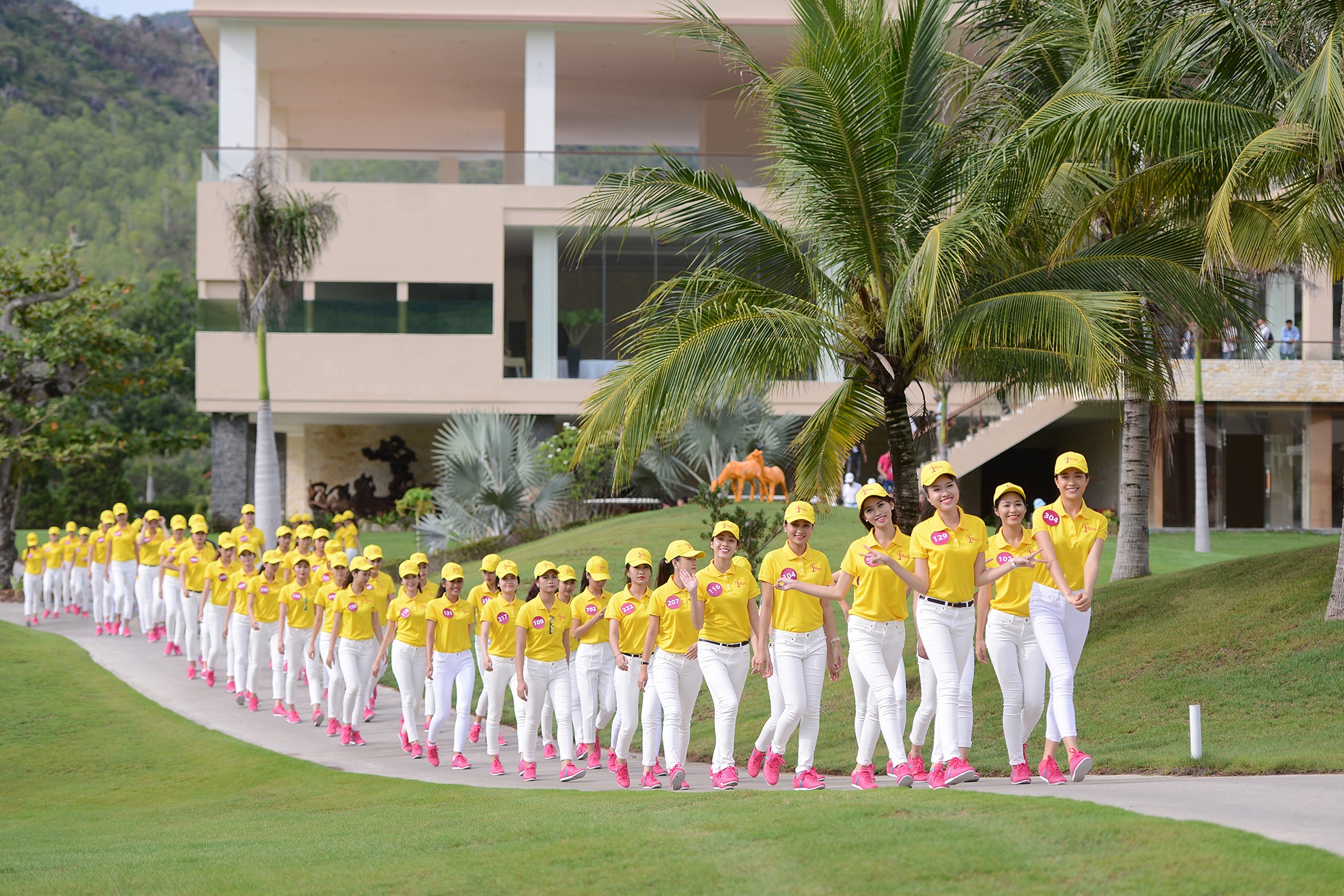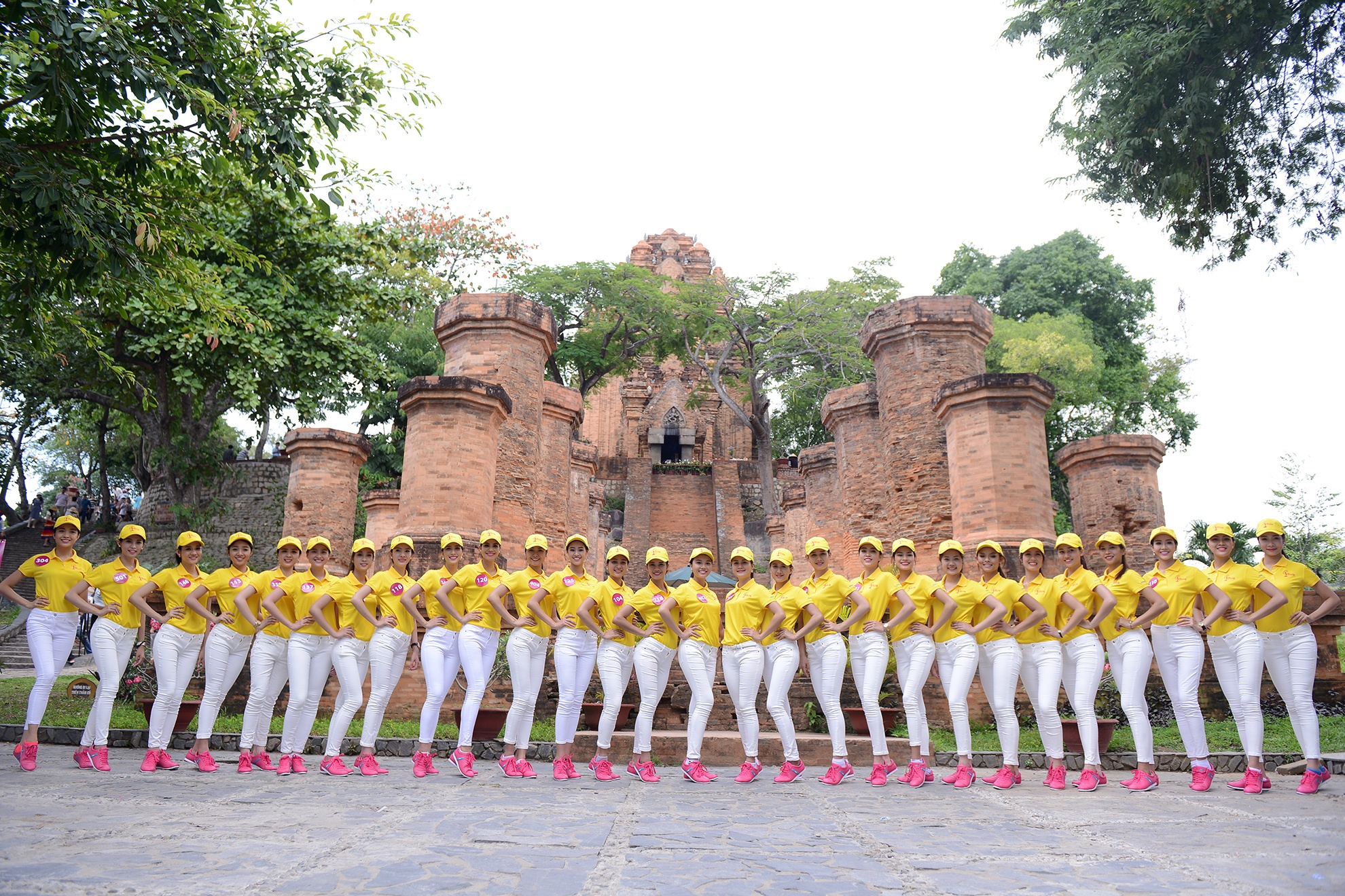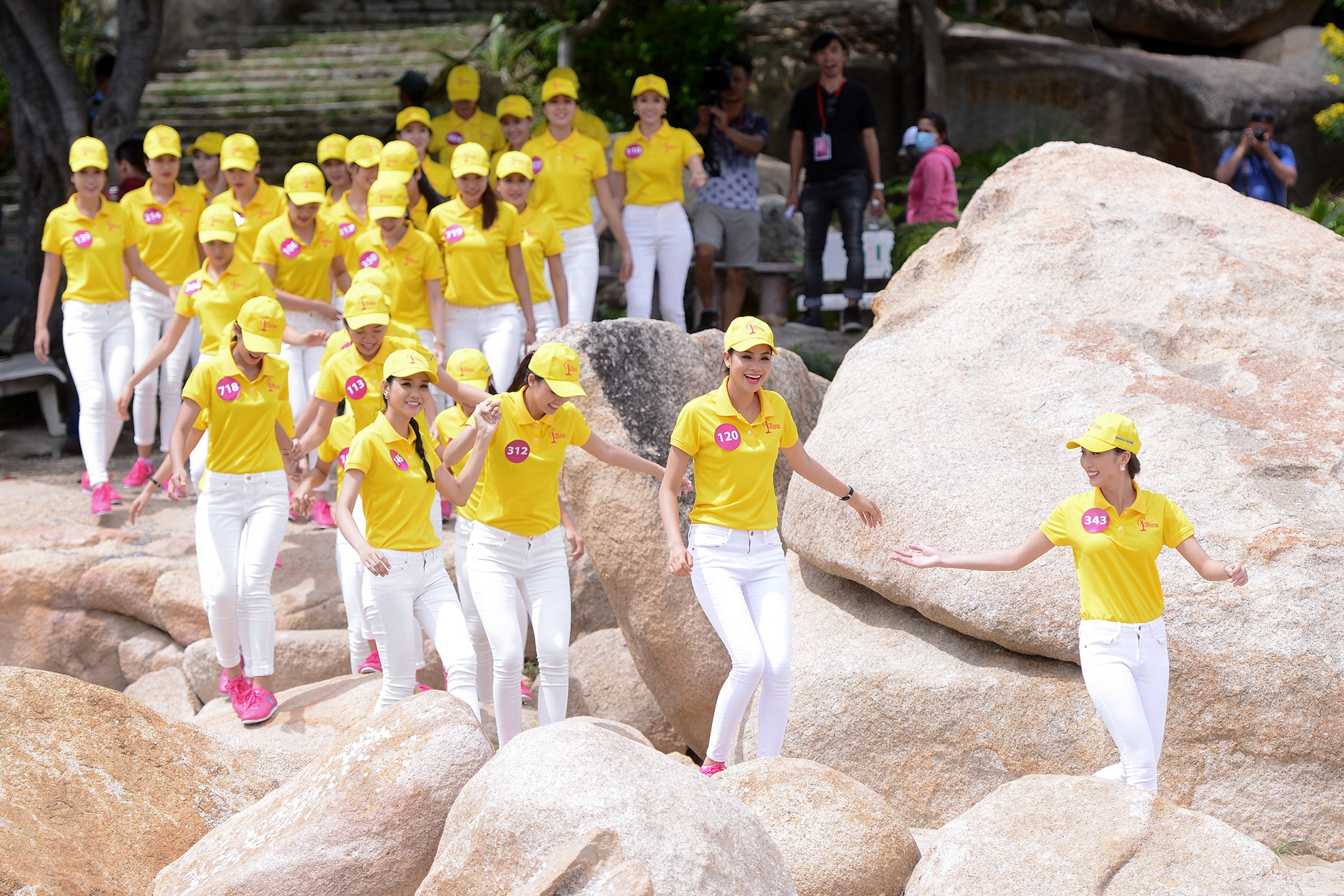 | Các thí sinh khoẻ khoắn và năng động trong trang phục quần jeans trắng, áo thun vàng. |