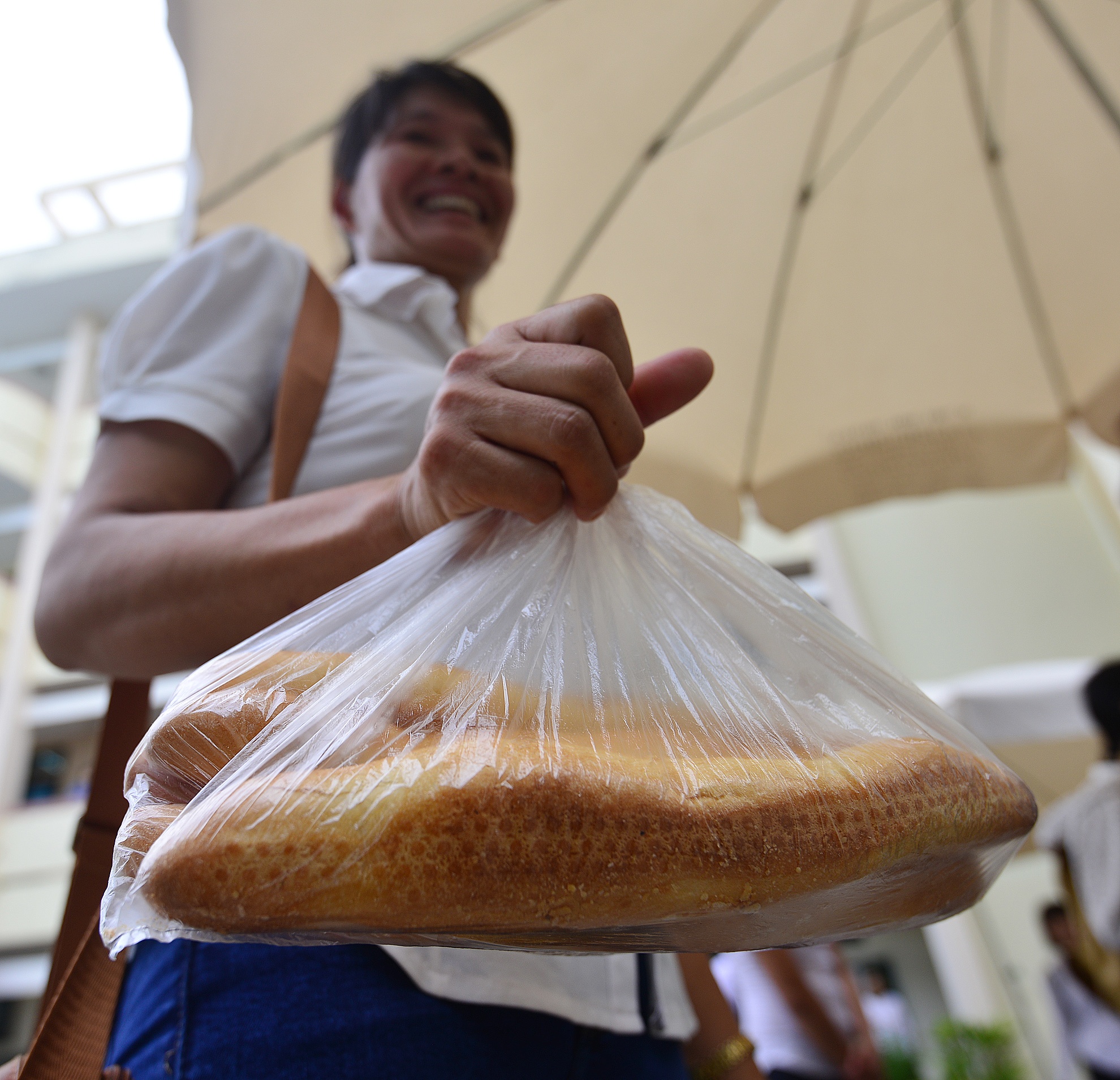 Chị Nguyễn Thị Nho (quê Lục Nam, Bắc Giang) cùng con trai đi từ 5h sáng lên Hà Nội. "Chưa kịp ăn sáng nên tôi phải mua thêm chiếc bánh mì ăn lót dạ", chị nói.
