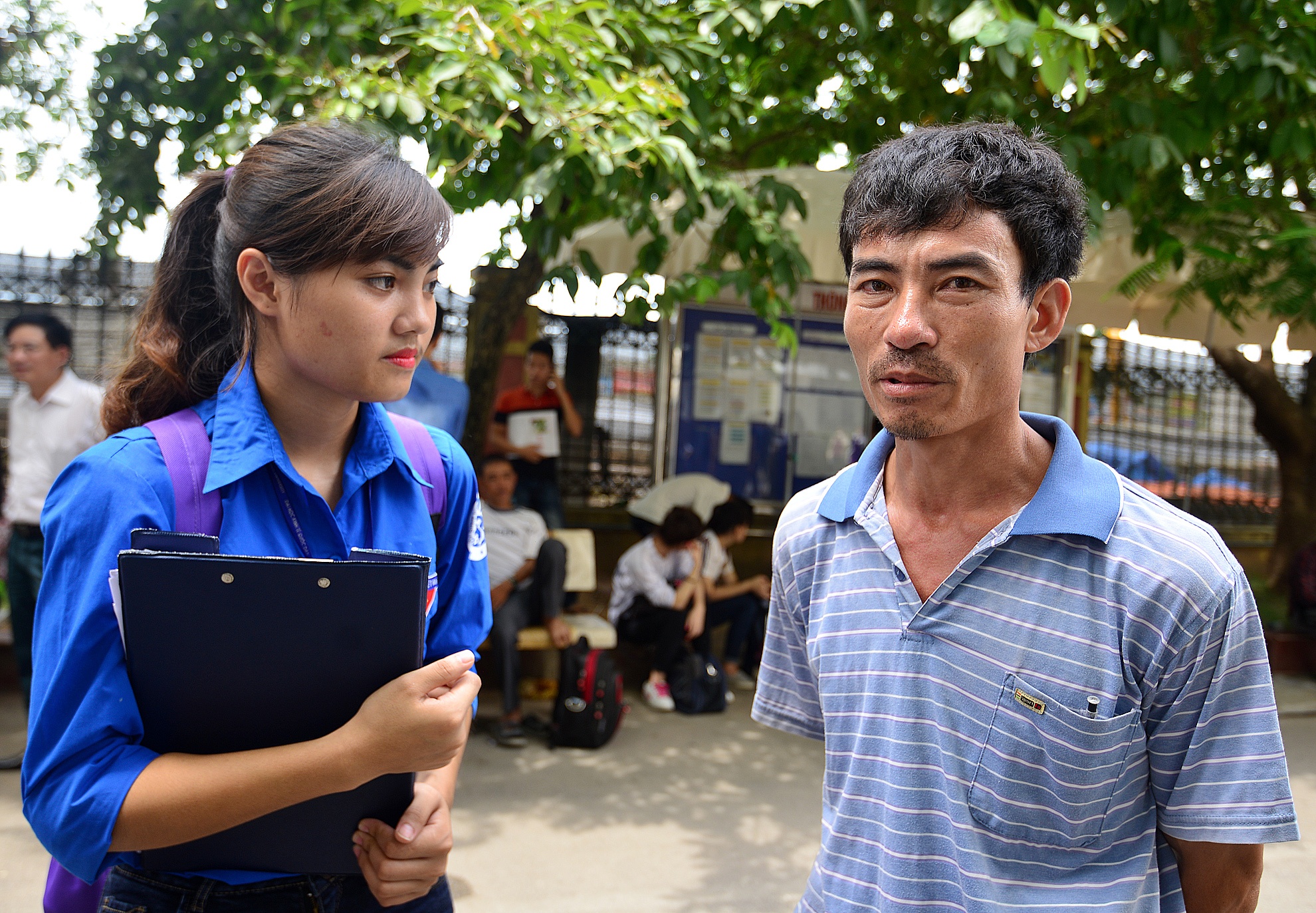 | Ông Đinh Văn Anh (TP Ninh Bình) được sinh viên tình nguyện tư vấn trước khi rút hồ sơ. Con trai ông được 21,25 điểm và mong muốn nộp hồ sơ vào ĐH Giao thông Vận tải. |