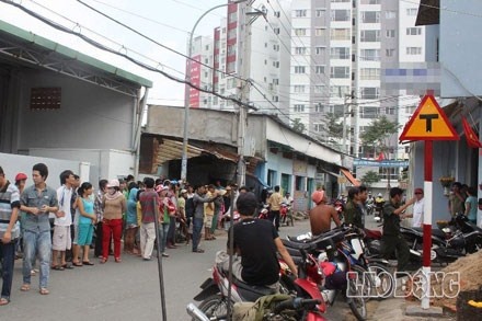 | Người dân hiếu kỳ tập trung trước nhà trọ nơi xảy ra vụ án mạng. |