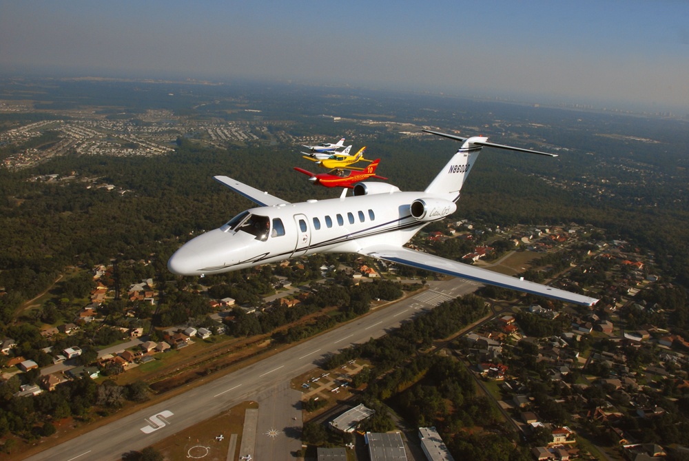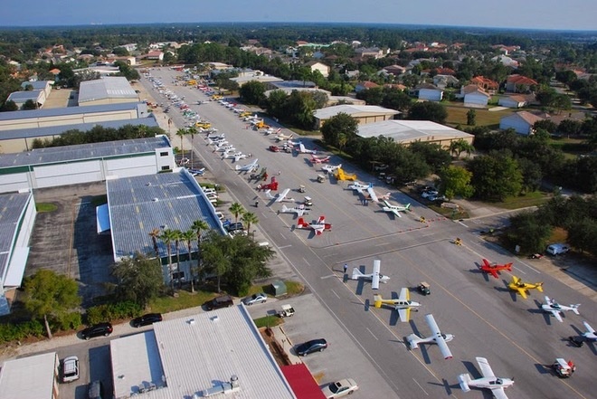 Máy bay xếp hàng dài trên sân bay Spruce Creek ở thị trấn cùng tên thuộc bang Florida, Mỹ. Đây từng là sân bay quân sự trong Chiến tranh Thế giới thứ hai. Sau khi nó ngừng hoạt động, người dân thị trấn xây nhà xung quanh. |