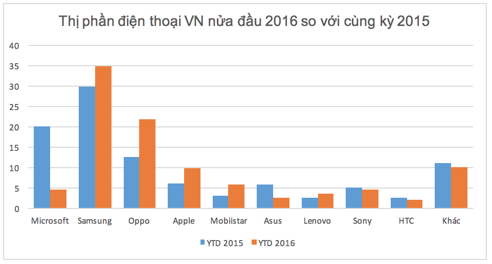 Nếu cộng cả Samsung và Oppo, hai thương hiệu này chiếm hơn nửa thị trường. Đây là kết quả không gây bất ngờ, bởi cả hai đã chiếm 45% thị phần smartphone Việt Nam 2015, theo số liệu từ IDC.