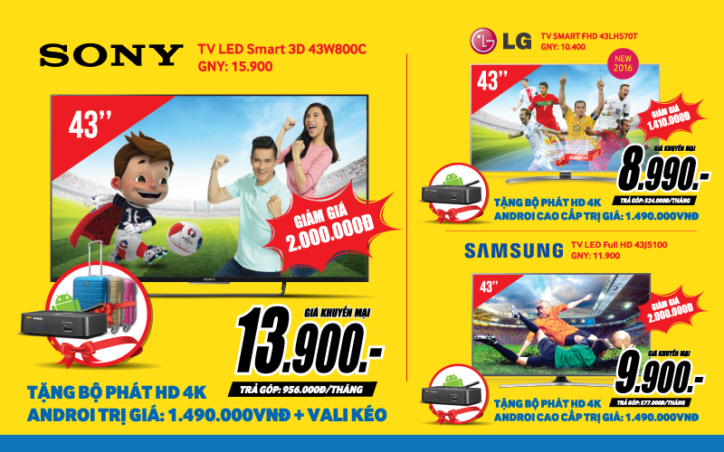 SmartTV ngày càng được ưa chuộng do nhu cầu đọc tin tức, xem Youtube… trên TV ngày càng tăng cao. Giá thành của SmartTV chỉ cao hơn 1-2 triệu đồng so với TV LED thường cùng thương hiệu, cùng size màn hình. Một số model SmartTV giảm giá sâu đợt này: TV LED Smart 3D 43 inch Sony 43W800C giảm 2 triệu đồng còn 12,5 triệu đồng, TV Smart FHD 43 inch Samsung 43LH570T giảm 1,4 triệu đồng giá còn 8,99 triệu đồng tặng bộ phát HD 4K Androi trị giá 1,49 triệu đồng…