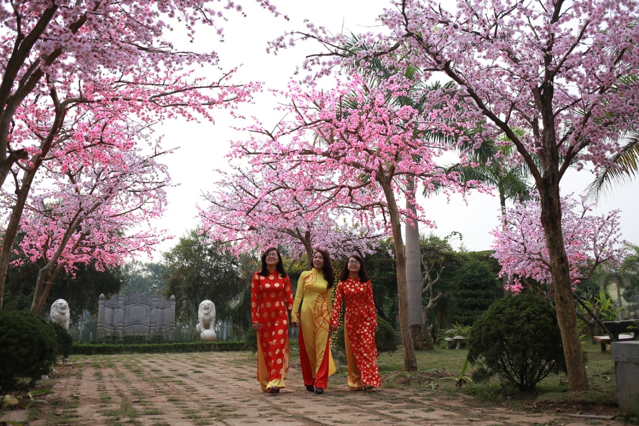 | Nét nổi bật ở khu vườn thượng uyển là hoa anh đào lộng lẫy, hoa giả màu hồng nhạt xen lẫn với sắc thắm của hàng hoa đào thật, tất cả hòa quyện và tạo nên một vườn đào mùa xuân rực rỡ sắc màu. |