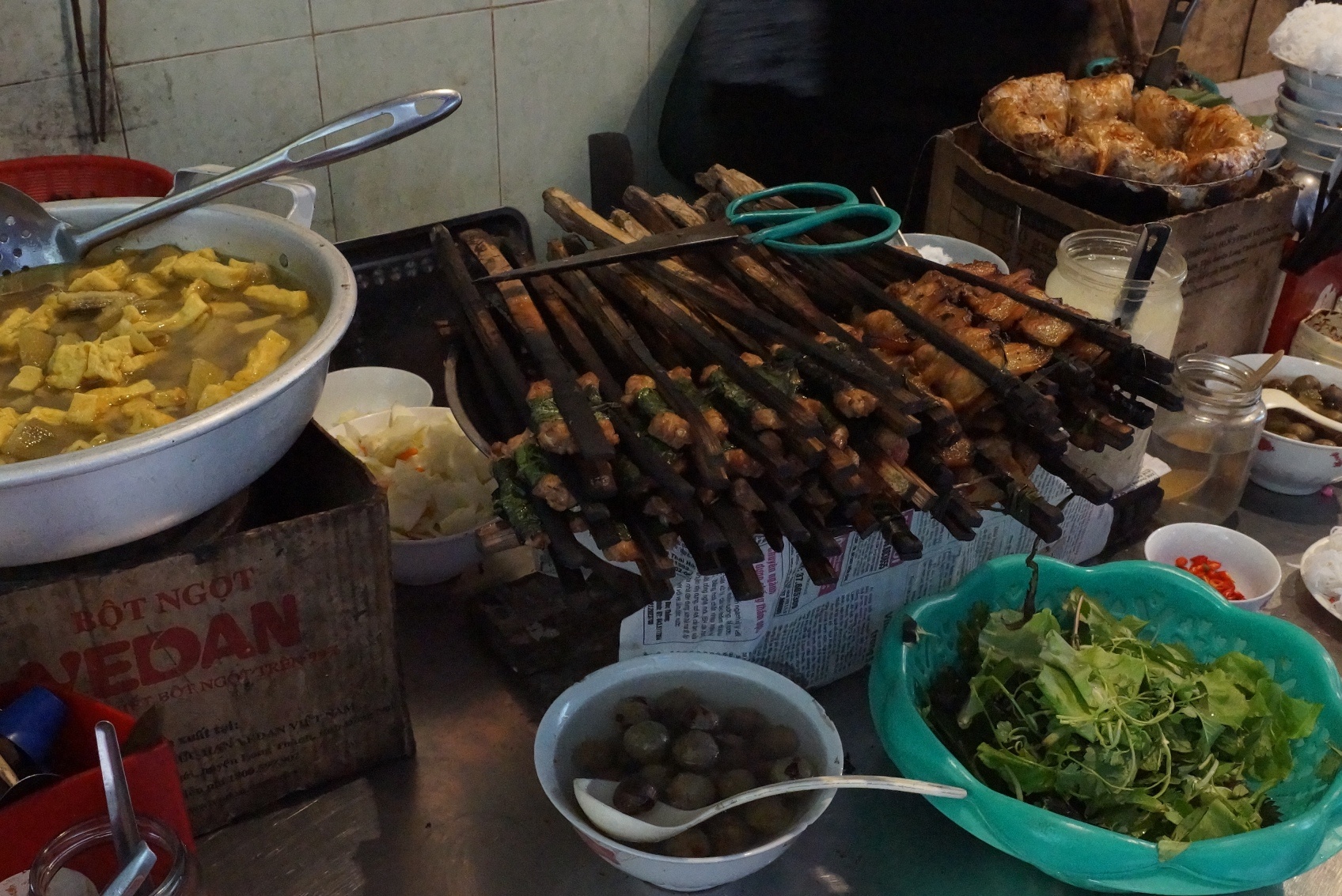 | Bên cạnh bún ốc, bún chả cũng được thực khách liệt kê trong danh sách các món phải thưởng thức khi tới "thiên đường rút ví" này. Bún chả kẹp que tre nướng là món ăn ít thấy trên các tuyến phố của thủ đô nhưng riêng tại ngõ chợ này, các hàng bún chả kẹp tre nằm san sát nhau, hàng nào cũng đông nườm nượp khách. Giá bún chả kẹp tre ở đây chỉ khoảng 25.000 - 30.000 đồng/bát, rẻ hơn các nơi khác ở Hà Nội. |