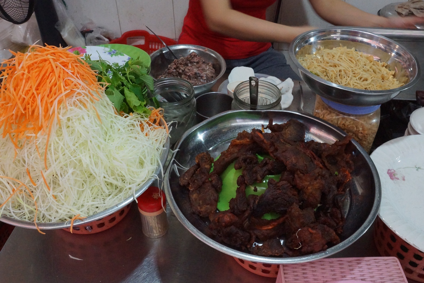 | Một đĩa nộm bò đầy đủ giá khoảng 20.000 đồng. Chủ quán tâm sự: "Muốn trụ lại ở đây thì không thể làm ăn chớp cháp được đâu. Thịt phải ngon, rau phải sạch và nhất là giá cả hợp lý. Nhiều khách du lịch tới ăn nghĩ hàng chợ là hàng linh tinh là sai lầm nhé. Đồ ăn ngõ chợ người Hà Nội ăn mấy chục năm nay rồi!" |