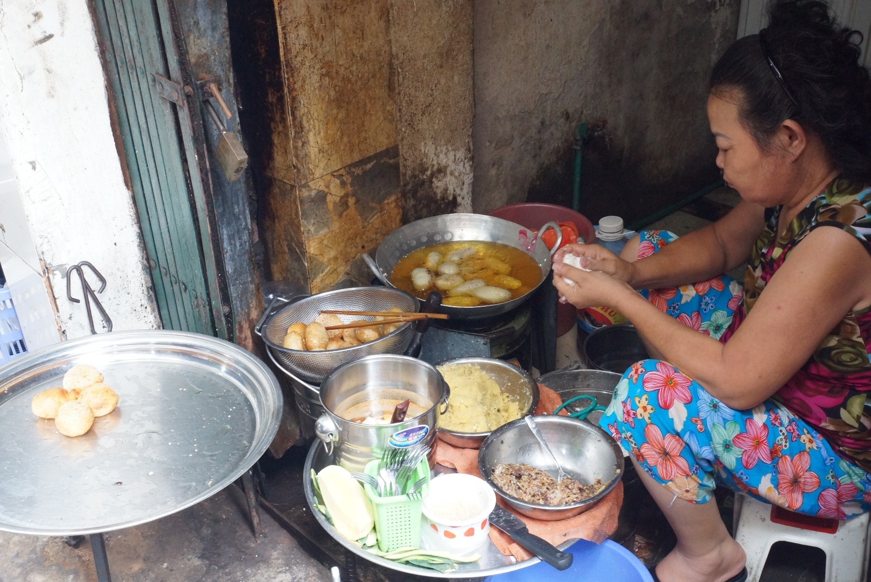 | Ngoài các món ăn thay bữa trưa, ngõ chợ Đồng Xuân còn nổi tiếng với nhiều món quà vặt ngon lành, giá rẻ. Bà chủ cửa hàng bánh tôm này vui vẻ cho biết: "Không biết bánh tôm Hồ Tây có trước hay bánh tôm nhà tôi có trước đâu nhé. Có những khách ruột của quán bà tới đây ăn từ khi còn bé tí, nay đã là bố, là mẹ trẻ con rồi". |