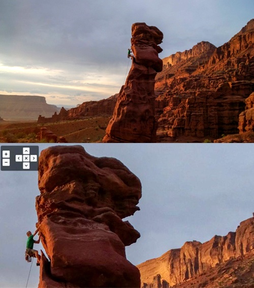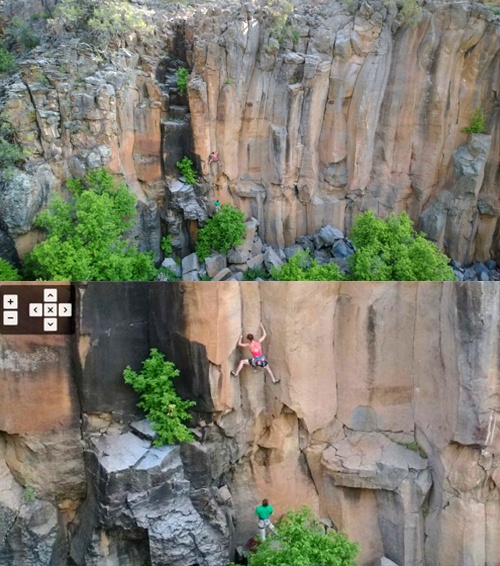 | Nhà leo núi như một chấm nhỏ giữa vách đá cheo leo, nhưng bạn vẫn có thể thấy cả sợi dây cáp khi zoom hết cỡ. |