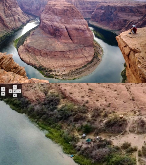 | Ảnh chụp eo Horse Bend nổi tiếng của con sông Colorado từ độ cao 250m. Stephen đang dừng chân nghỉ ngơi sau chuyến đi gian nan do đất lở. Xa xa, bạn có thể đếm được những chiếc lều do thợ thuyền kayak dựng lên. |
