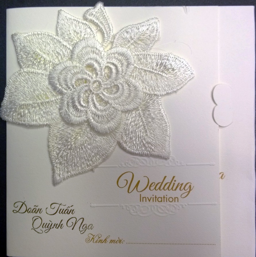 Từng chi tiết trong đám cưới đều được Doãn Tuấn và Quỳnh Nga chăm chút cẩn thận. Ngay cả thiệp cưới, cả hai cũng chọn cách đặt mẫu thiết kế riêng theo đúng ý muốn của cô dâu - chú rể. Trong đó, giấy làm thiệp được đặt của Italia, còn loại vải ren dùng để làm hoa đính trên thiệp được đặt mua ở Thái. Giá thành để làm một tấm thiệp mời đắt gấp đôi, thậm chí gấp ba những loại thiệp cưới được in đại trà.