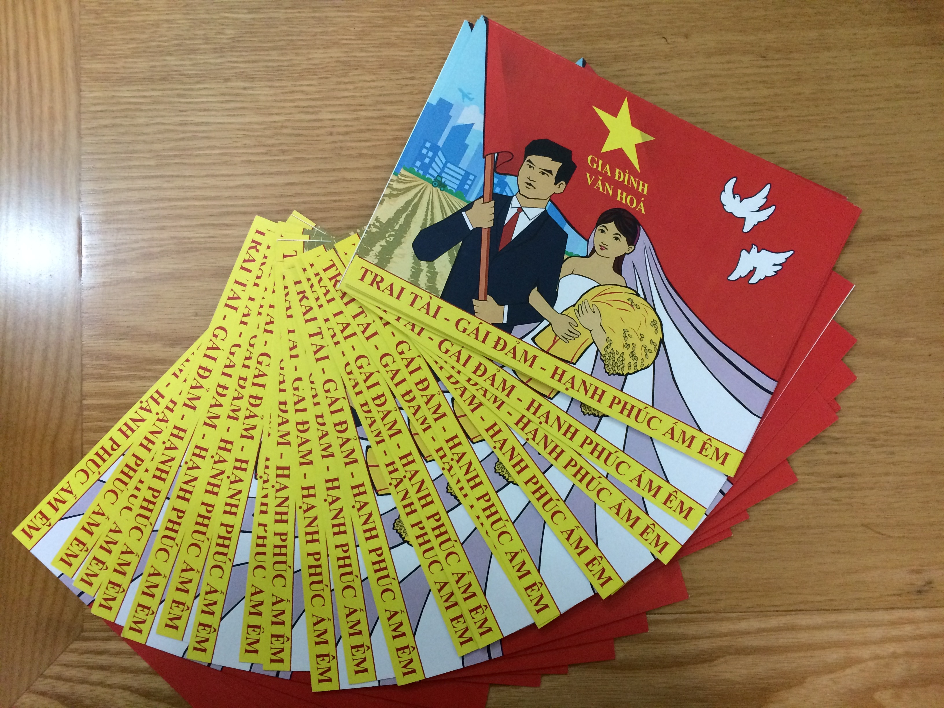Chú rể Đức Thành là người yêu thích thể loại tranh vẽ cổ động. Anh từng có thời gian nghiên cứu và sưu tập các loại tranh thuộc trường phái này. Sau khi có bản phác thảo bằng tay của vợ, Thành mất 2 ngày để vẽ lại bằng máy tính. Nhờ từng học một khoá về thiết kế tại trường Arena nên Thành không gặp nhiều khó khăn trong việc tạo ra một tấm thiệp độc cho chính mình.