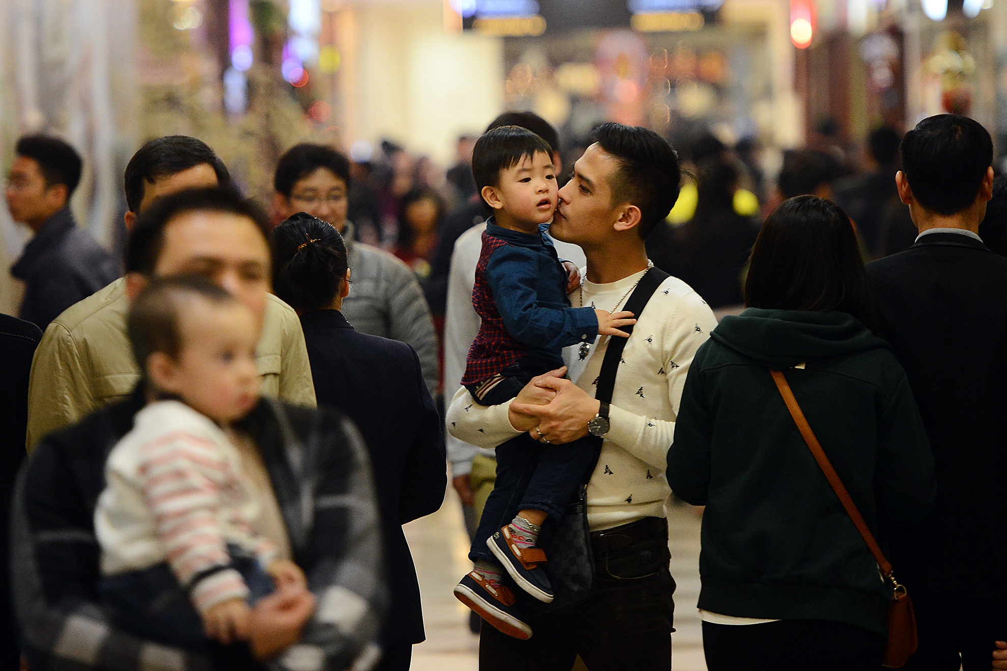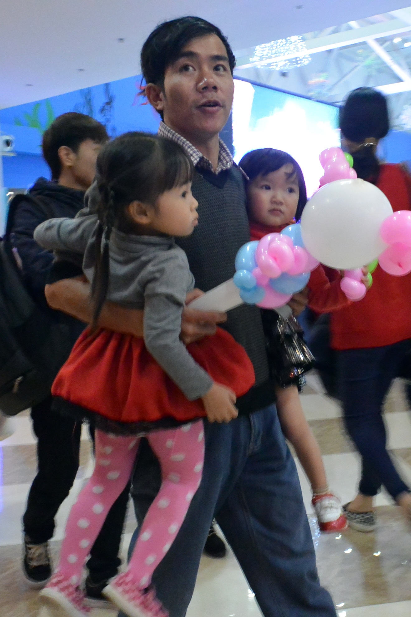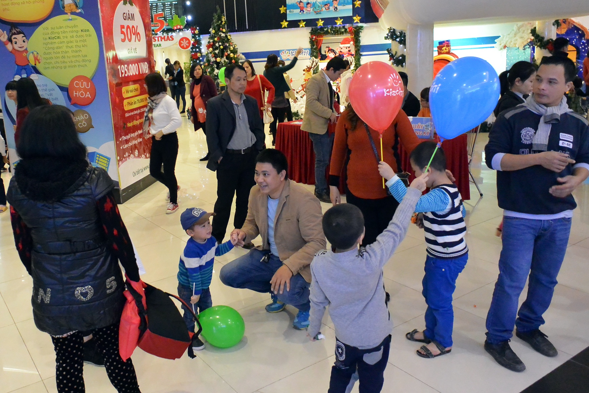 | Nhiều em bé được cha mẹ đưa đi chơi ở trung tâm thương mại Royal City. |