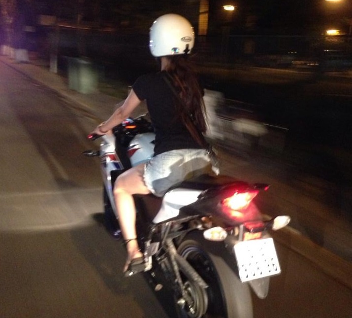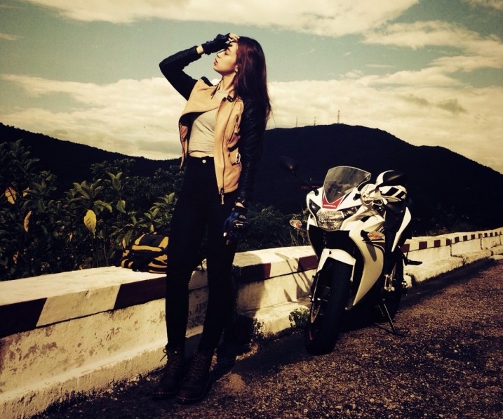 | Khi được hỏi khi mới bắt đầu chạy xe phân khối lớn có gặp nhiều trở ngại, cô cho biết, “Mình mất 1 tiếng để có thể chạy được xe. Nếu cảm nhận tốt thì chạy rất dễ, vì cơ bản xe tay côn nó xử lý như xe số sàn, nên mình cứ dựa theo nguyên lý đó và lái thôi. Cũng được coi là năng khiếu lái xe. Lúc đầu mình chỉ lái xe 150CC, lần thứ 2 chuyển lên 600 CC và lần thứ 3 thì thử luôn chiếc 1000 CC”. Sau 3 tuần chạy thử cô quyết định chọn mua chiếc Honda CBR150R, có giá hơn 100 triệu đồng. |