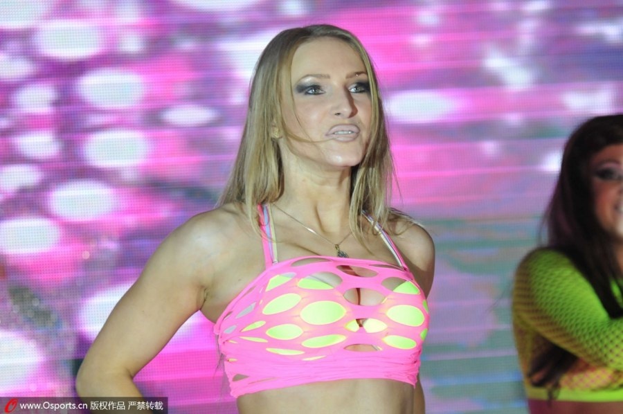 | Ba vũ công mặc bikini sặc sỡ biểu diễn những động tác vô cùng sexy khiến cả hội trường bỗng nóng lên. |