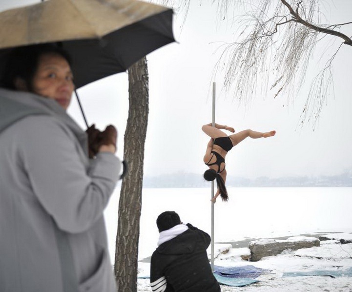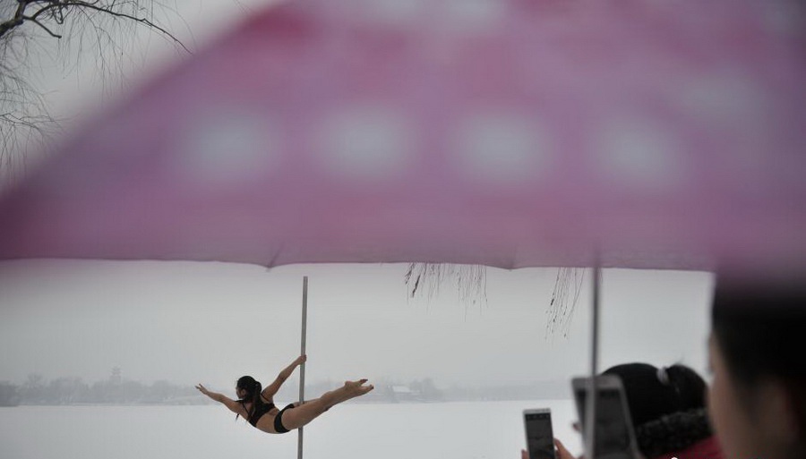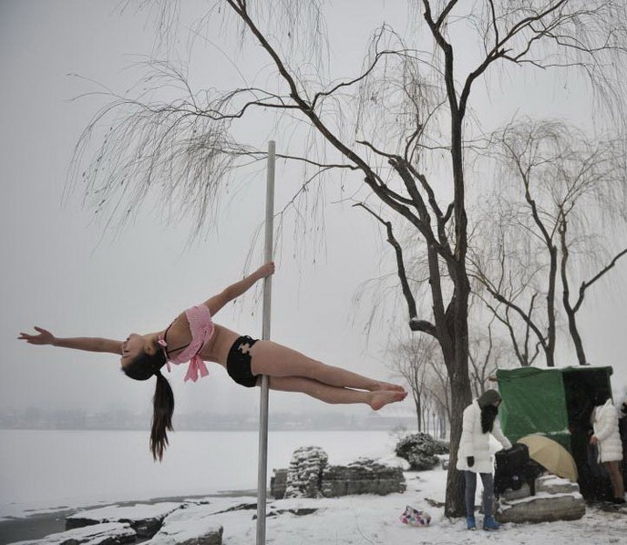| Trong khi những người khác mặc ấm, quàng khăn, thiếu nữ múa cột diện trang phục gợi cảm. Ảnh: China News. |
