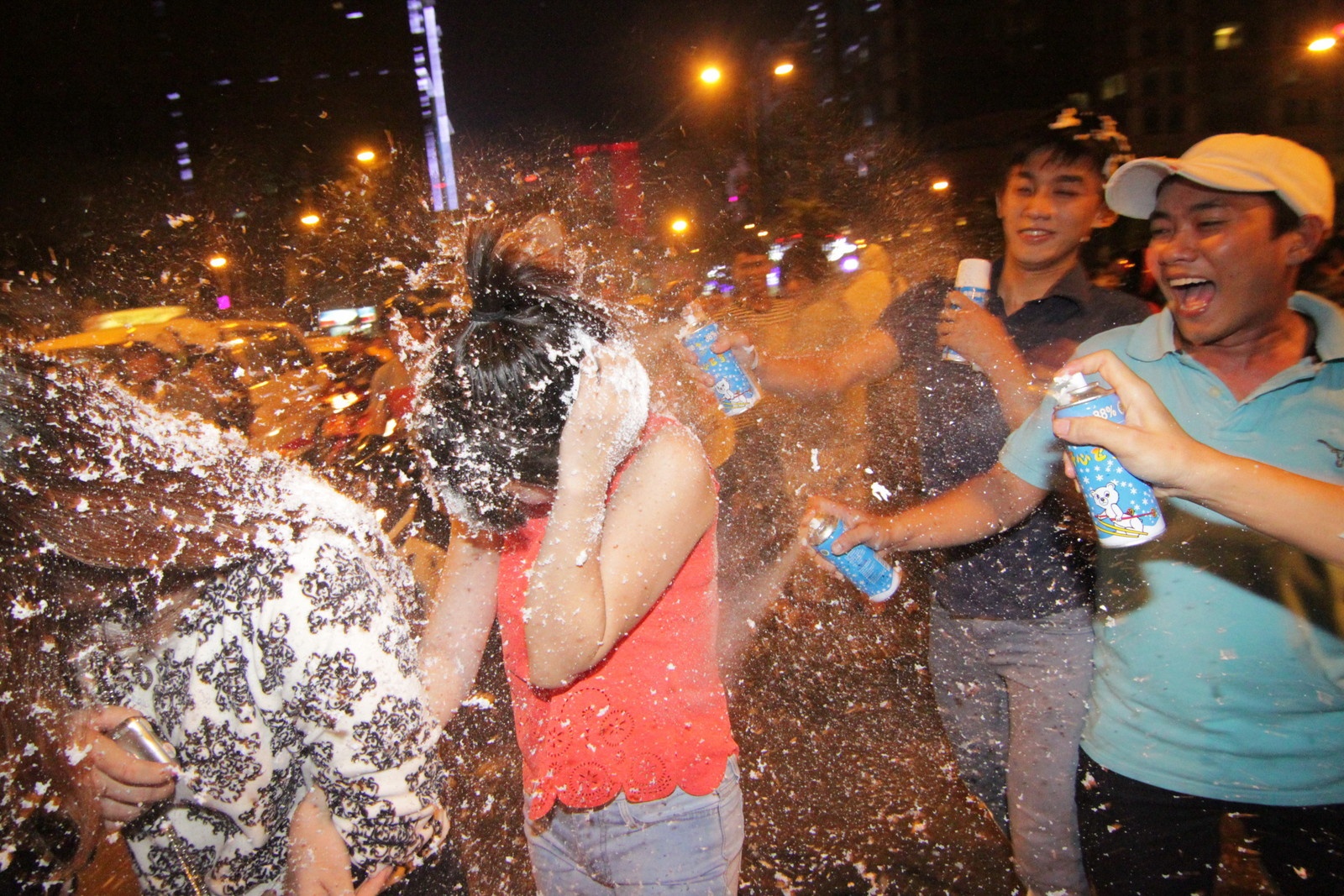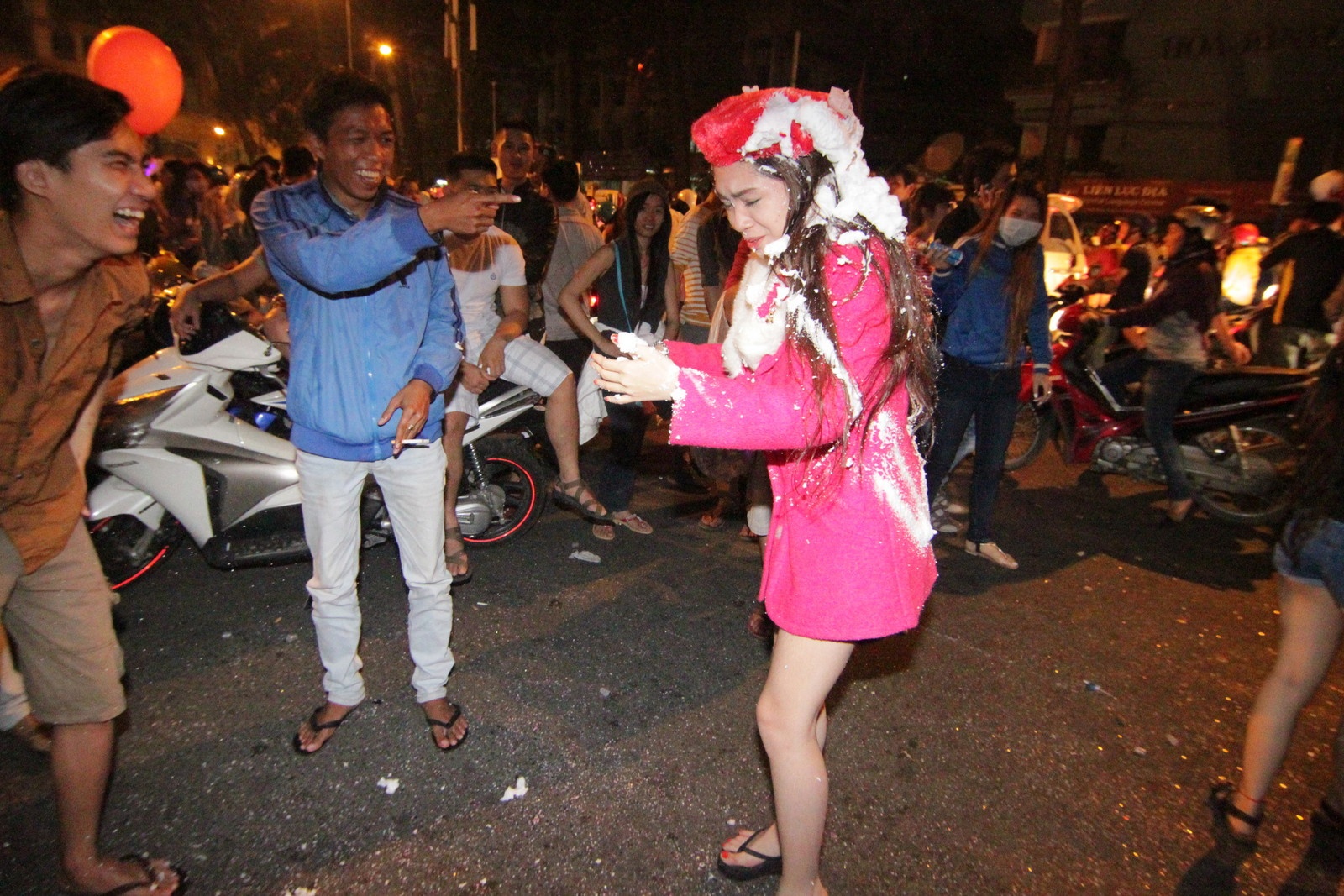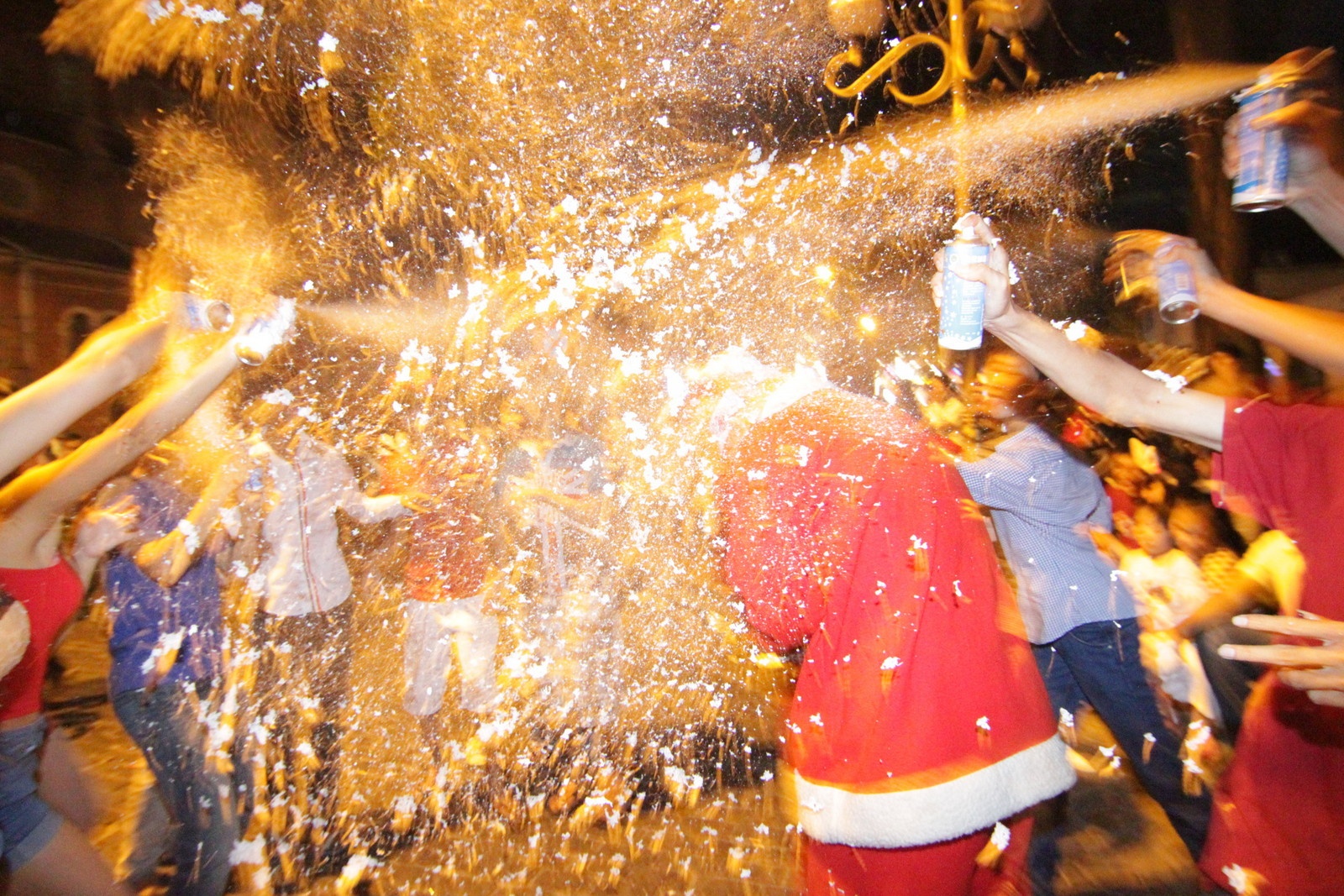 Đêm Giáng sinh nhiều bạn trẻ Sài Gòn với những bình xịt tuyết đã phun loạn xạ vào người đi đường, khiến không ít người bị ướt, lấm lem.