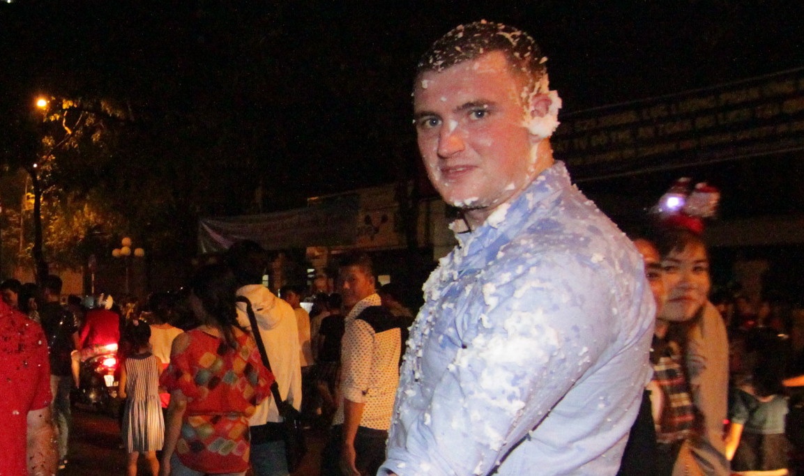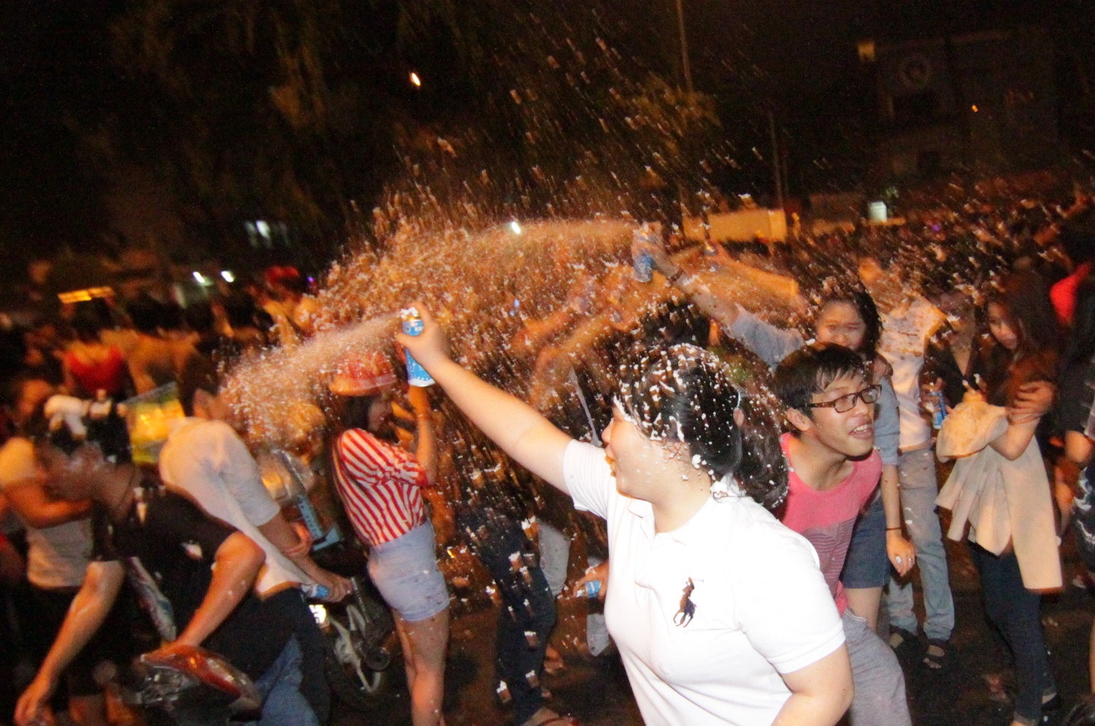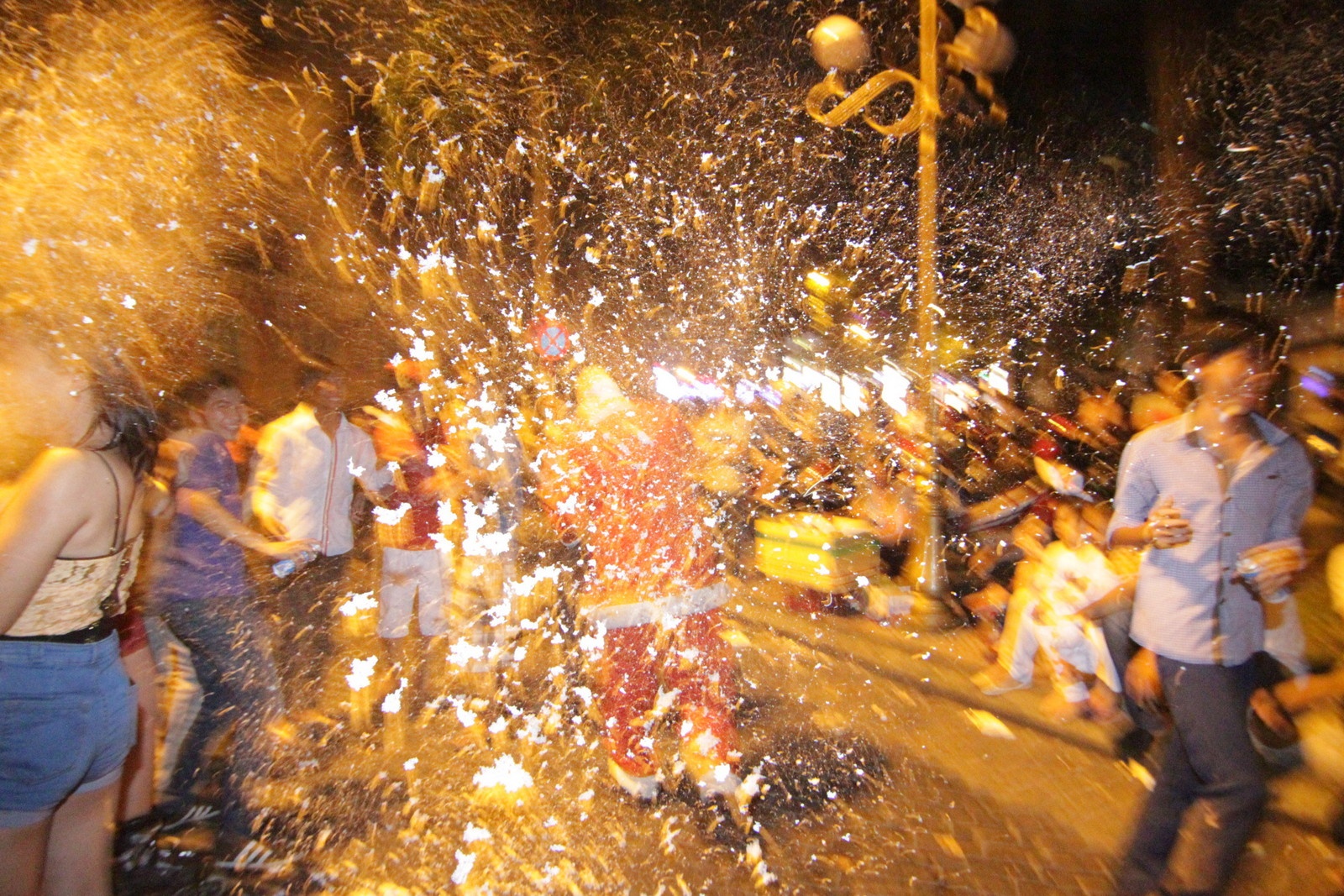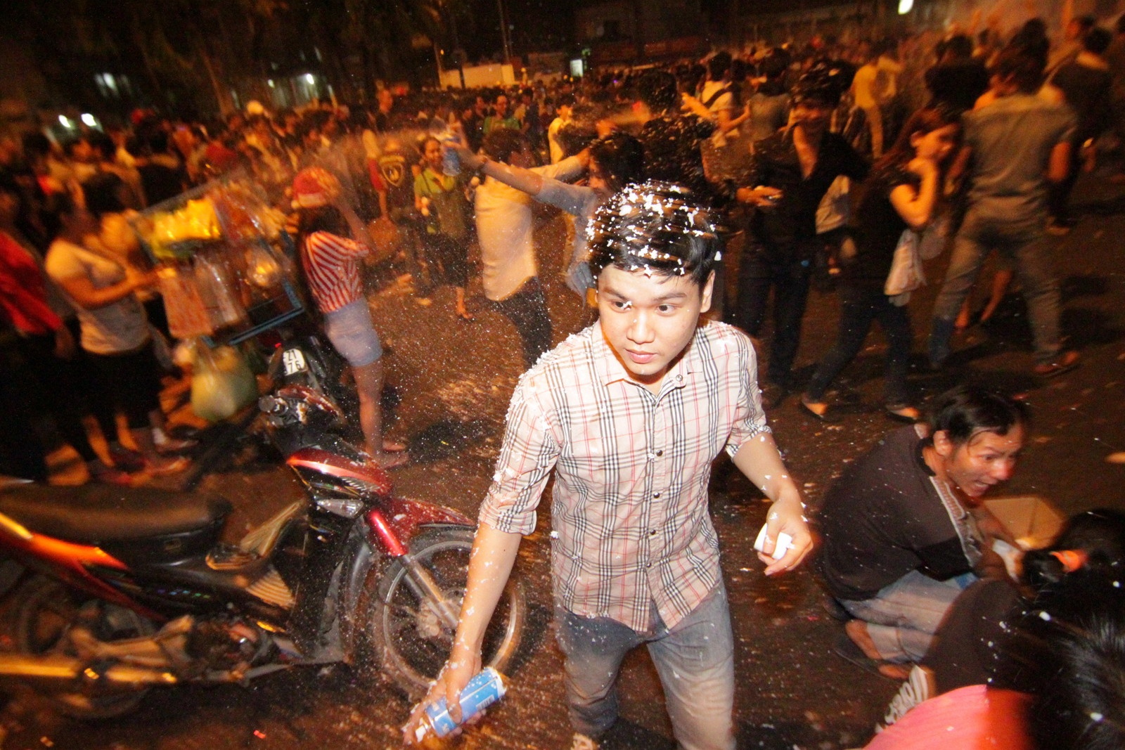 Đêm Giáng sinh nhiều bạn trẻ Sài Gòn với những bình xịt tuyết đã phun loạn xạ vào người đi đường, khiến không ít người bị ướt, lấm lem.