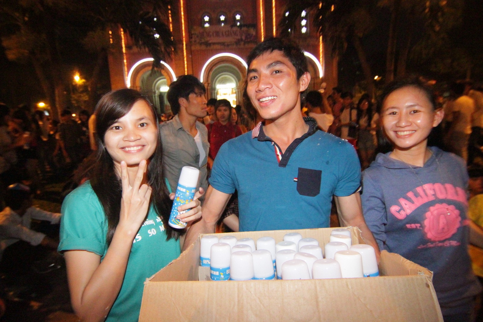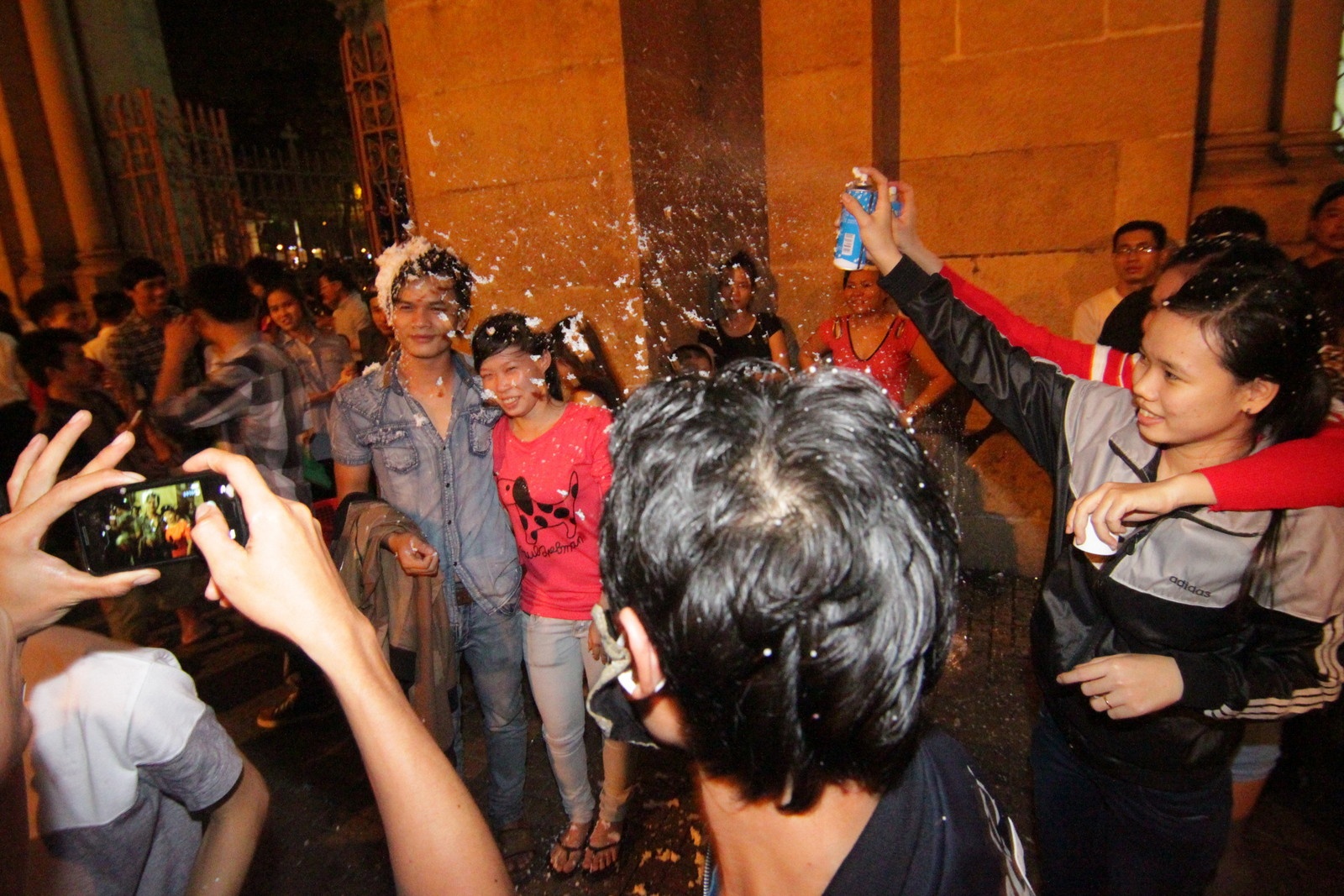Trong đêm Giáng sinh, nhiều bạn trẻ Sài Gòn tự tạo niềm vui cho nhau bằng cách xịt bọt tuyết lên người.