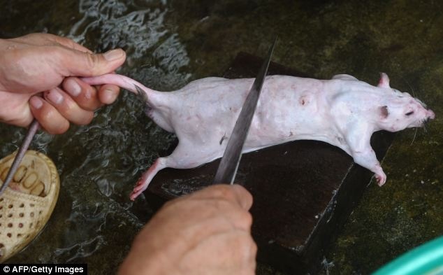 | Trước đây, chỉ một số khu vực ở miền bắc đồng bằng châu thổ sông Hồng và miền nam đồng bằng châu thổ sông Mekong ăn thịt chuột. Tuy nhiên, ngày nay, món thịt “đặc biệt” này đã xuất hiện ở nhiều nhà hàng, và được chế biến thành nhiều món ăn khác nhau, từ giả cầy cho đến luộc... Ảnh: Daily Mail. |